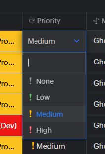 In the Tasks module, the Priority field supports clear color coding (e.g., gray for None, green/yellow for Medium, red for High), which makes it very easy to quickly understand urgency and importance at a glance.