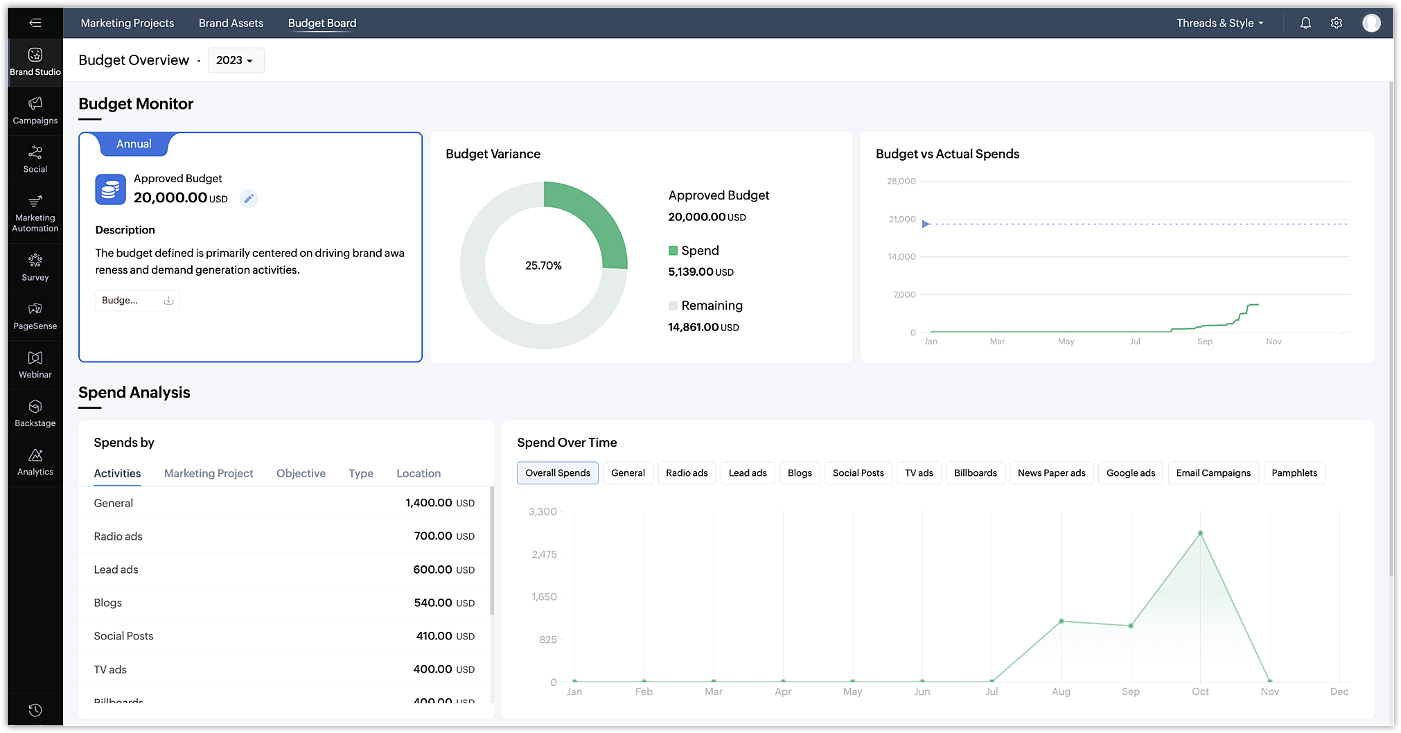 The budget can be defined annually, monthly, or for every quarter, depending on your preference. Various dashboards are available to help you monitor the expenses, identify the types of marketing activities on which you spent the most, and ensure you stay within the allocated budget.