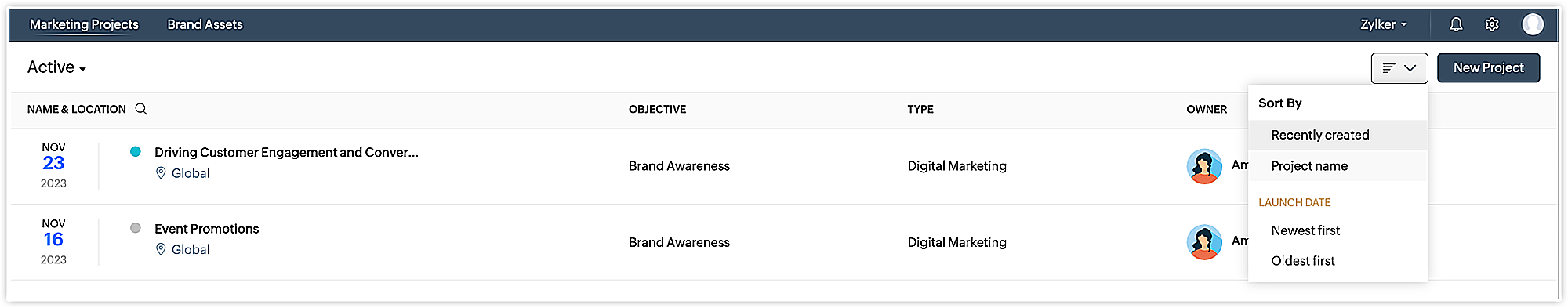 - Project name: Displays the marketing projects in alphabetical order from A-Z.