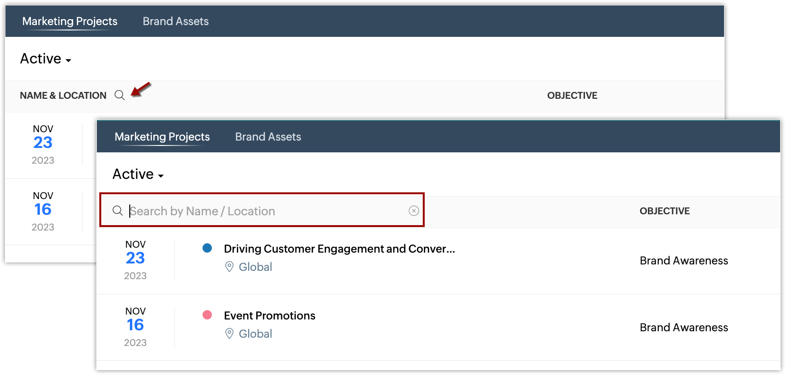 You can also search for a marketing project by its name and location to make it easy for you to find a single project from a huge list.
