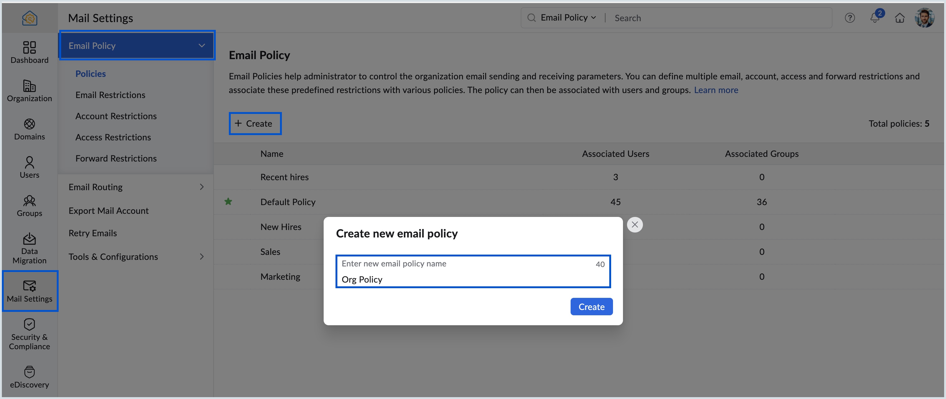 How to set an Email Policy in Zoho Mail Admin Console?