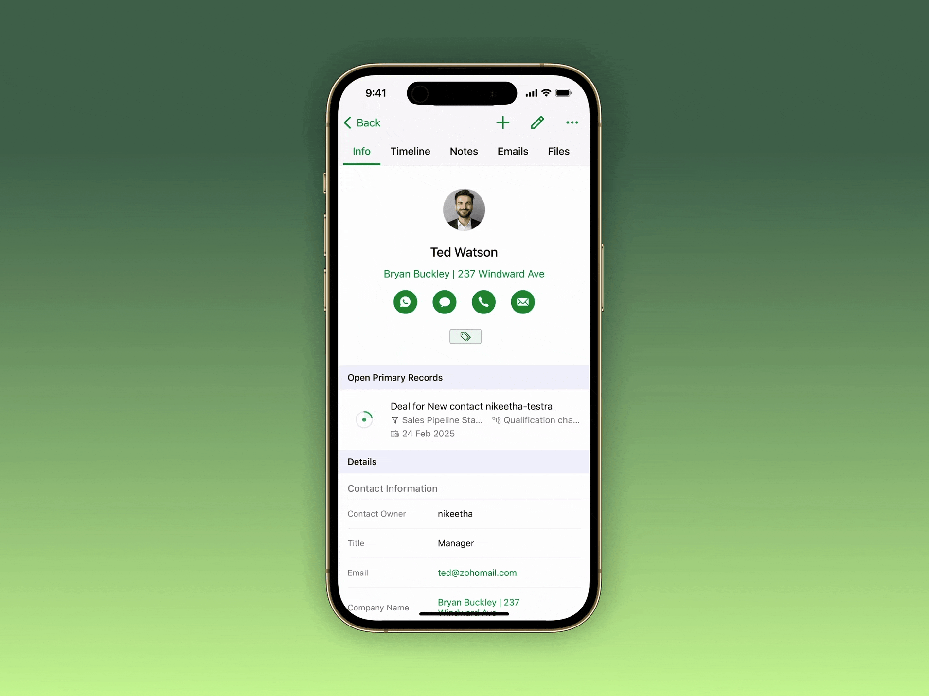 You can also tap the WhatsApp quick action icon or the phone number in the phone number field of the records details screen, which will navigate to the conversation view for the WhatsApp-integrated accounts.