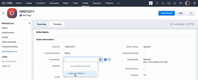 Zylker electronics sells TVs, washing machines, and ACs through retail and online channels. After delivery, Zylker confirms with the customer for installation support and comfortable Date and time. Once confirmed, the support team uses Quick Create from the delivered order to create an Installation Support record and schedule the technician without re-entering details and auto assigning technician based on product type and location in installation module. Sales rep clicks quick create, and selects only the preferred date and time. Rest will be auto filled.