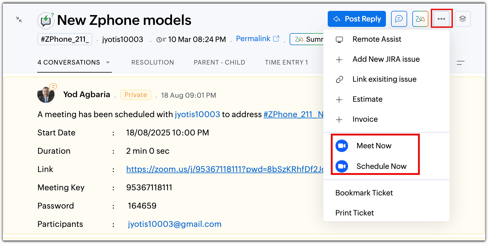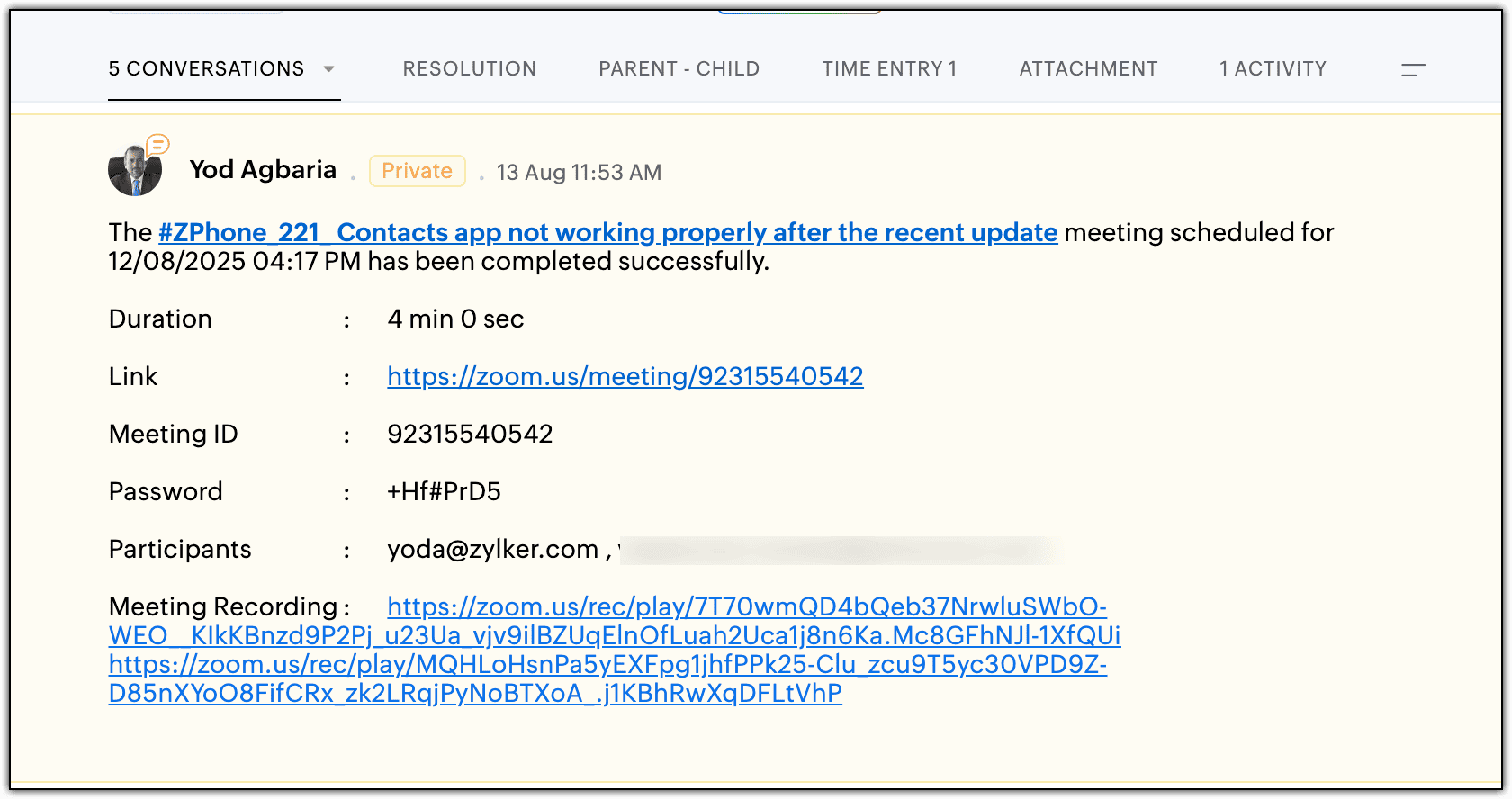 Once the meeting ends, all the details including the Duration, Link, Meeting ID, Password, Participants, and the link to the Meeting Recording are automatically recorded in the ticket under the Conversations tab for future reference.