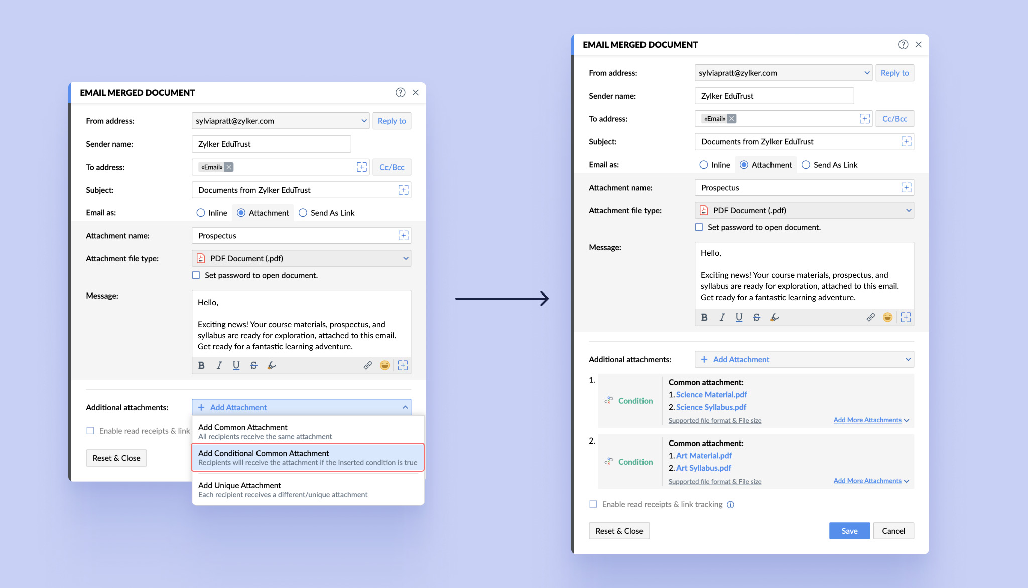 Zoho Writer's automation templates with conditional attachments ensure that your communications are not just personalized but precisely targeted. Set up conditions tied to values in a fillable form or mail merge data source and watch Zoho writer intelligently attach the appropriate files based on the conditions.