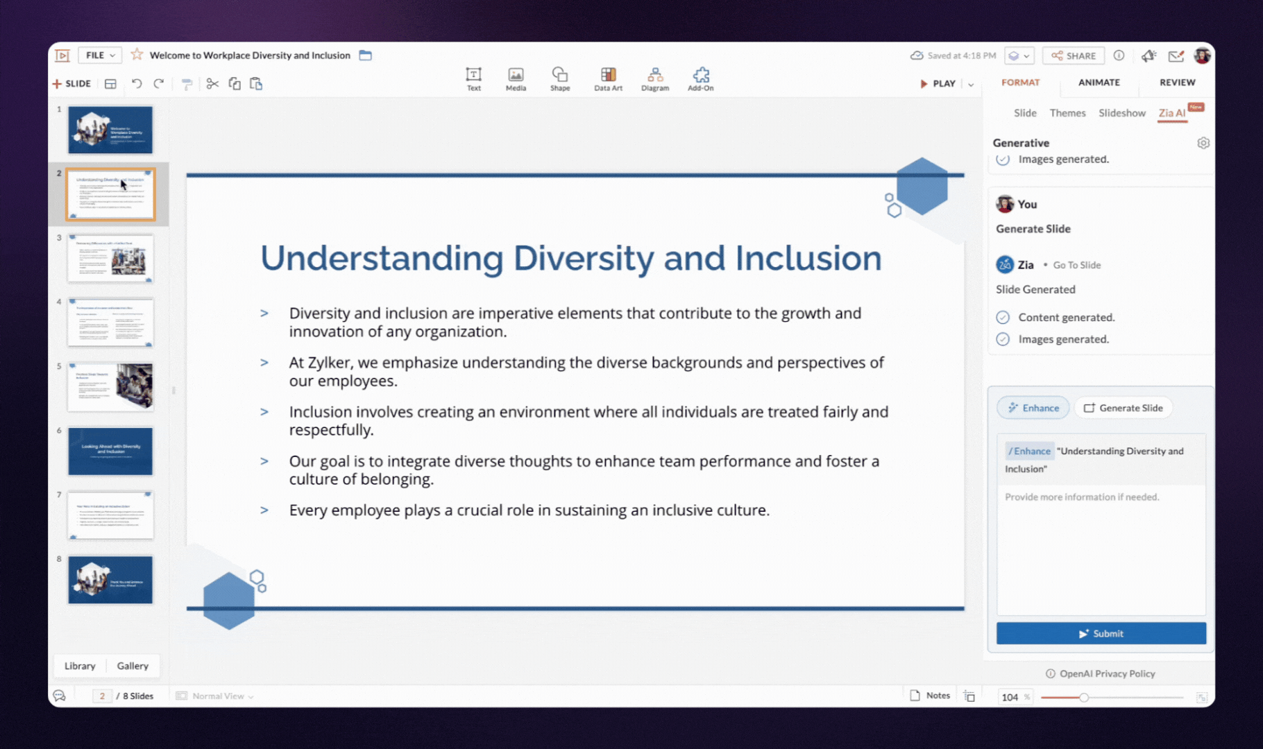 With Zia, you can generate both content and visuals for a slide based on its title. The text and images are designed to align well with your layout, reducing the need for manual adjustments.