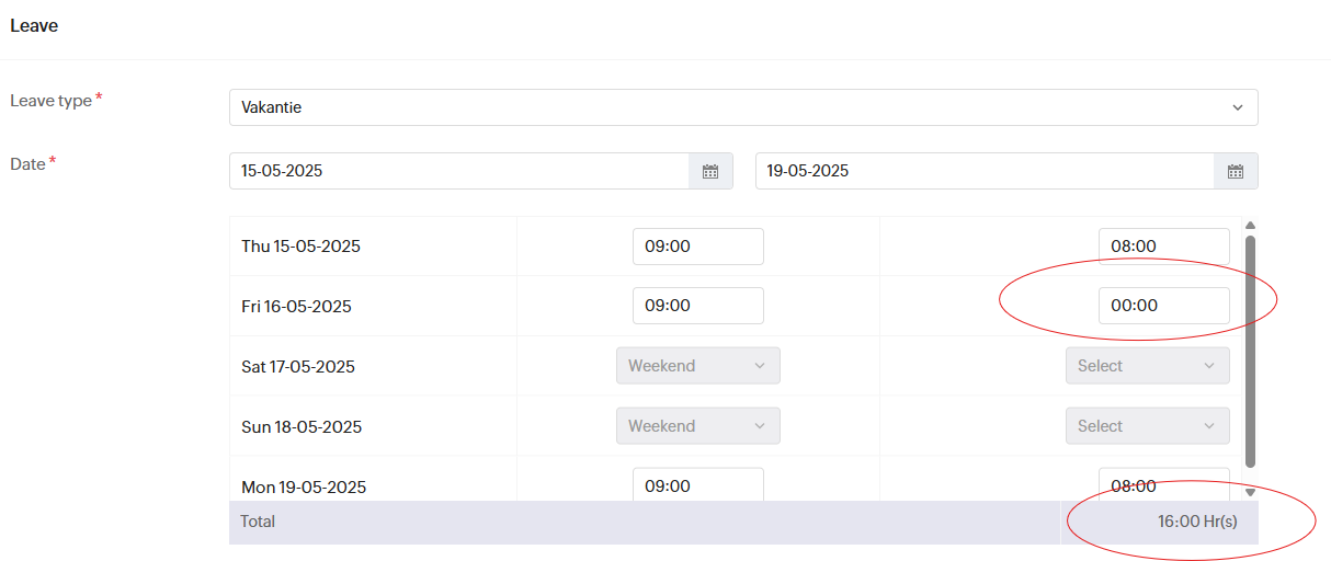 When a employee fills in a leave request for lets say a week, the duration of the leave request for that day of the week is set to 0 hours in the form.