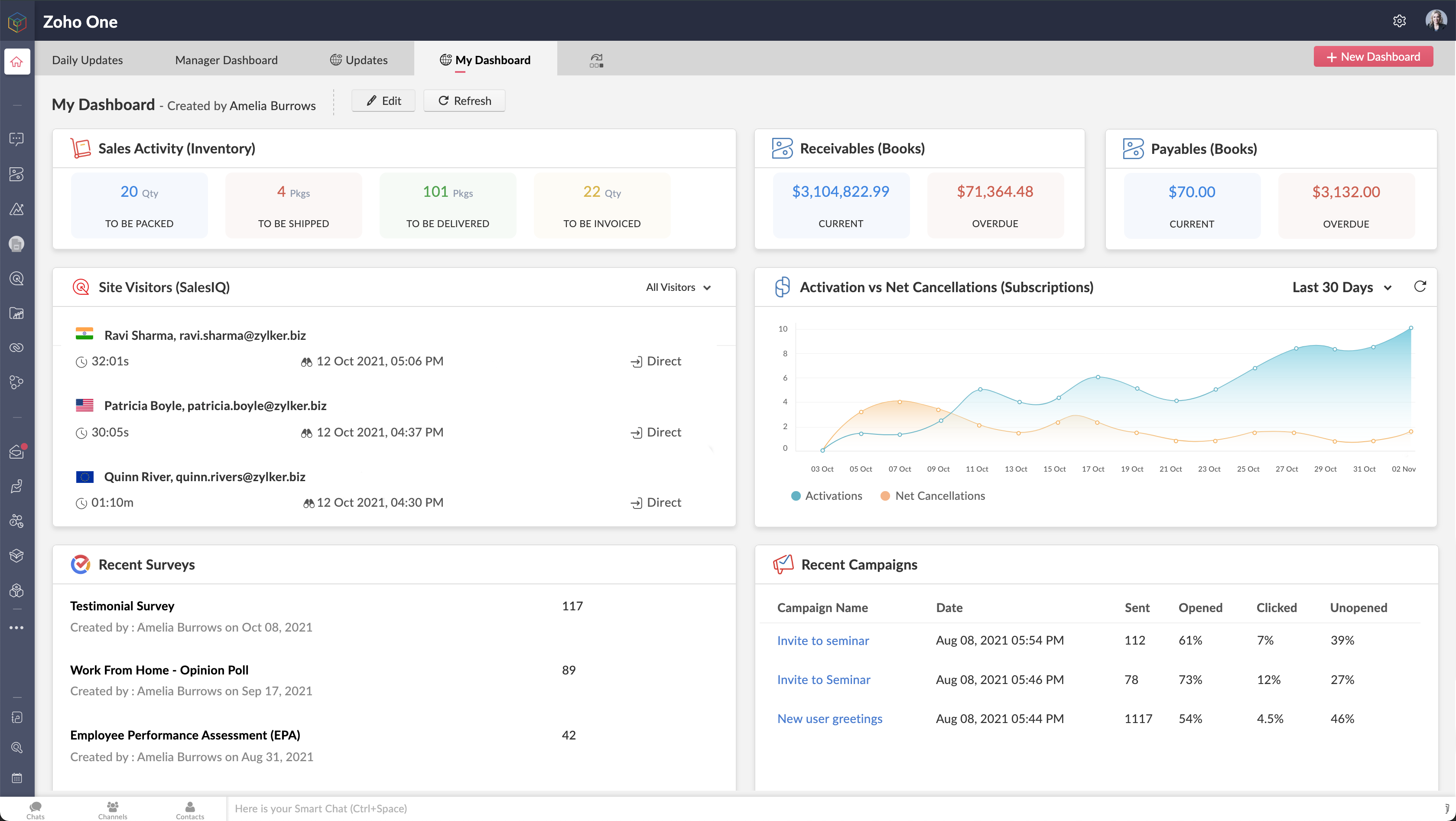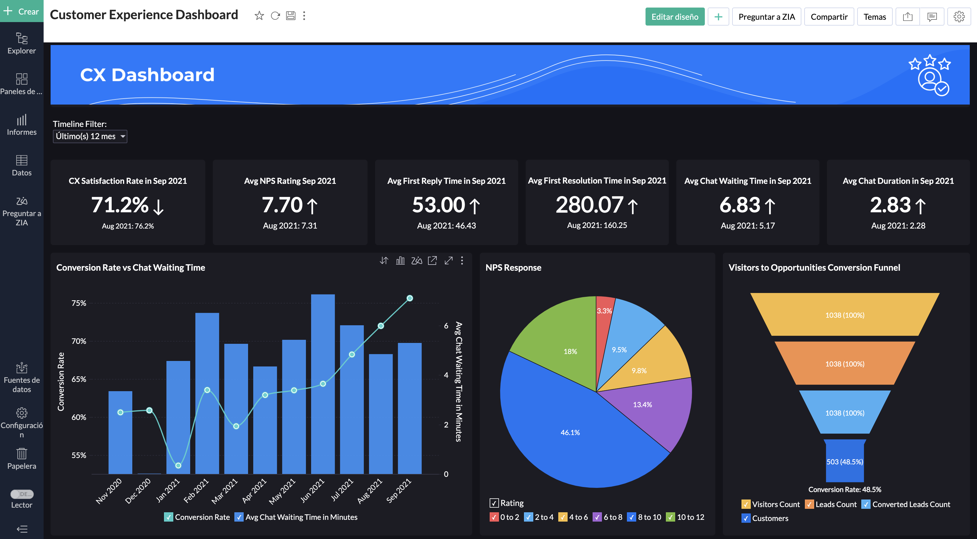 - BI integrado y conversacional: Zoho One pone a tu disposición más de 1.500 informes y paneles de análisis pre-construidos, con análisis integrados y conversacionales que permiten a los responsables de la toma de decisiones profundizar en los datos y obtener información interdepartamental, todo ello mediante comandos de lenguaje natural utilizando Zia Insights.
