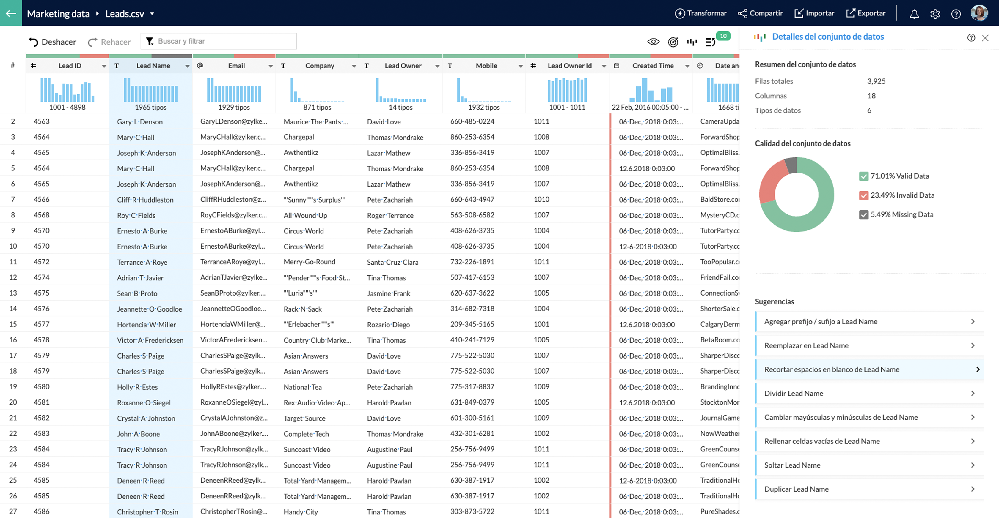 BI unificado y conversaciones en todo Zoho One- Preparación de datos: Zoho Data Prep, una herramienta de preparación y gestión de datos de autoservicio está ahora disponible en Zoho One. Tanto si los usuarios preparan datos de aplicaciones de terceros como de otras fuentes, DataPrep, con tecnología de aprendizaje automático, puede ayudarles a integrar, modelar, limpiar, transformar, enriquecer y catalogar los datos, así como a integrarlos con Zoho Analytics o con un tercero para obtener nuevos conocimientos.