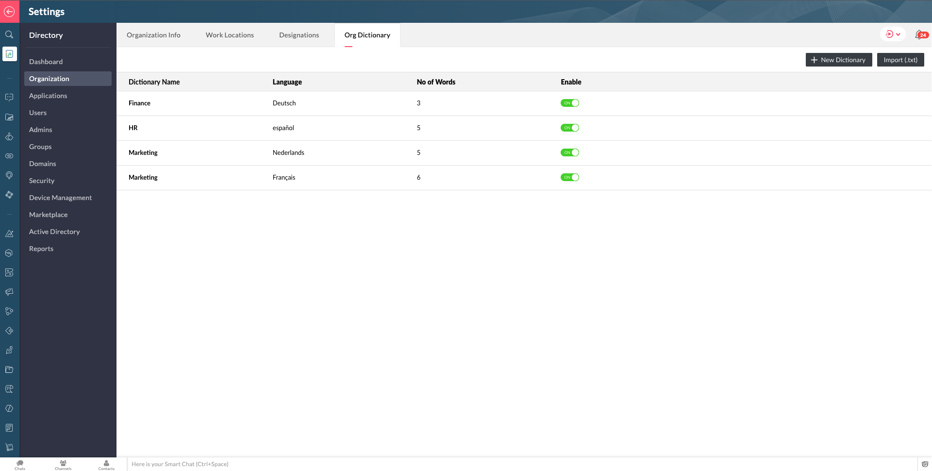 - Org Dictionary: Este nuevo servicio ofrece un diccionario central para toda la organización. Incorpora automáticamente el nombre de los empleados en la organización y otras fuentes, ofreciendo una dicción central y consistente a través de varias aplicaciones y usuarios de Zoho.