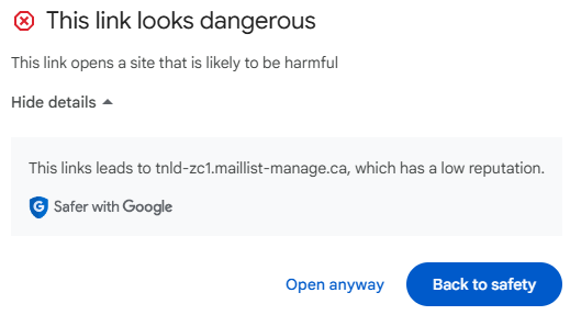 Google is trapping all the marketing automation emails in spam.  My domain has a perfect reputation and it looks like Zoho has a low reputation which is sending it to spam.  When I pull the email out of spam and click on a link in the email, I get this message: