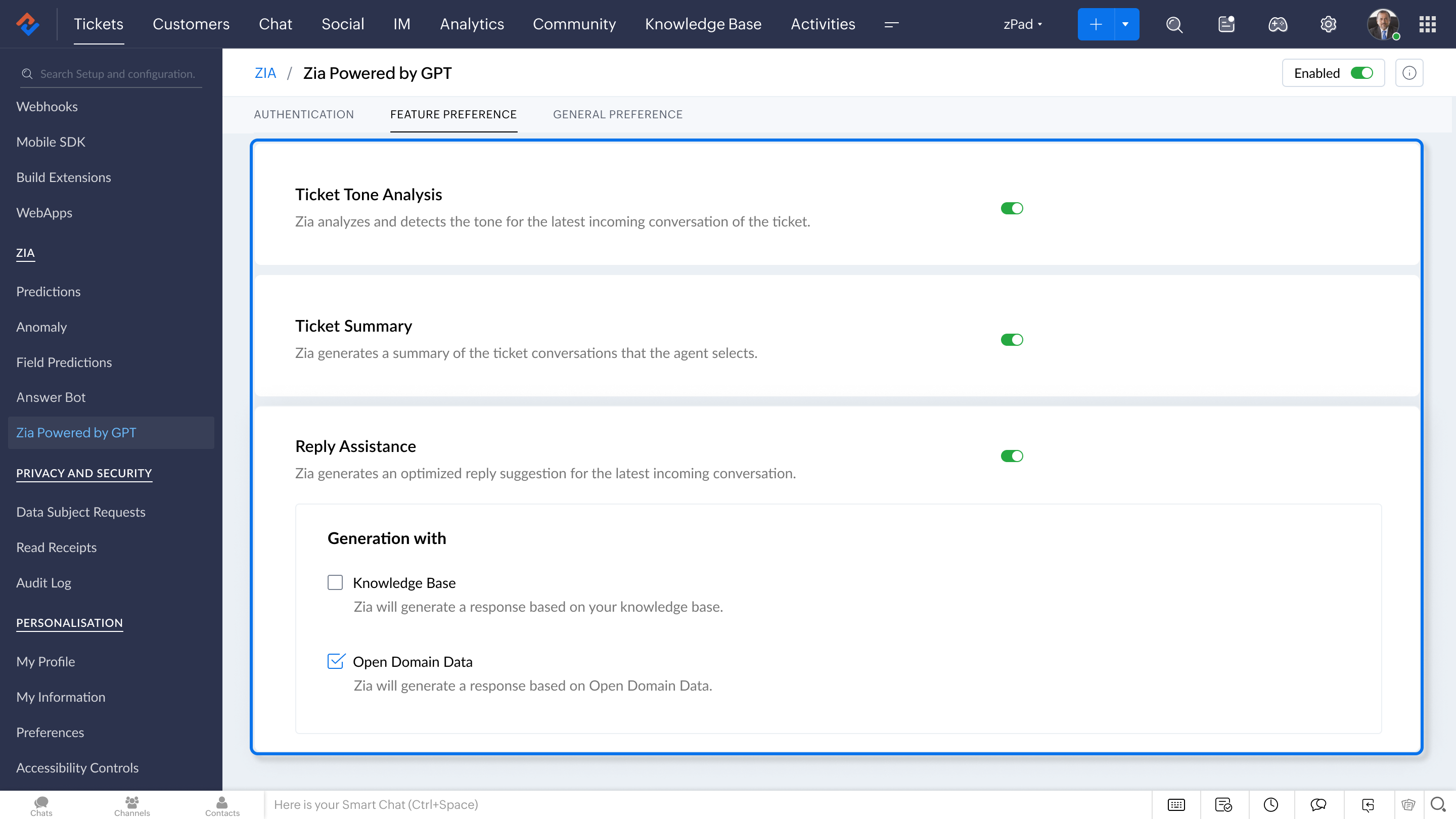 - Both knowledge base and ChatGPT: If a customer asks about a particular product and Zia is unable to find the information in the knowledge base, it will use ChatGPT to generate an informed response from the open-domain.