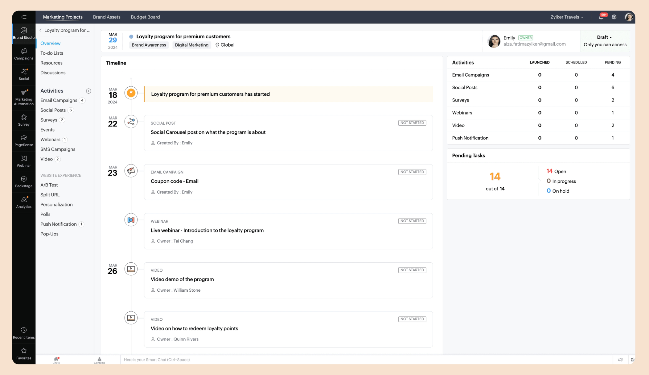 The ability to draft a marketing project before launching it serves to solve that problem. You can start by planning various marketing activities and assigning them to the appropriate team members. Once all the marketing activities are planned, you can see a complete timeline of how and when these marketing activities should be executed, who owns those activities, and the various tasks that are associated with those activities. You can also start adding the required resources for the marketing project.