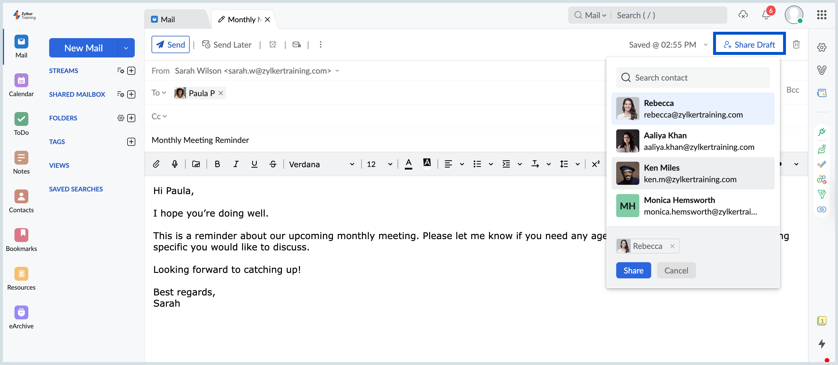 That’s where Zoho Mail’s Share Draft feature comes in, allowing you to share your email drafts safely within your team.