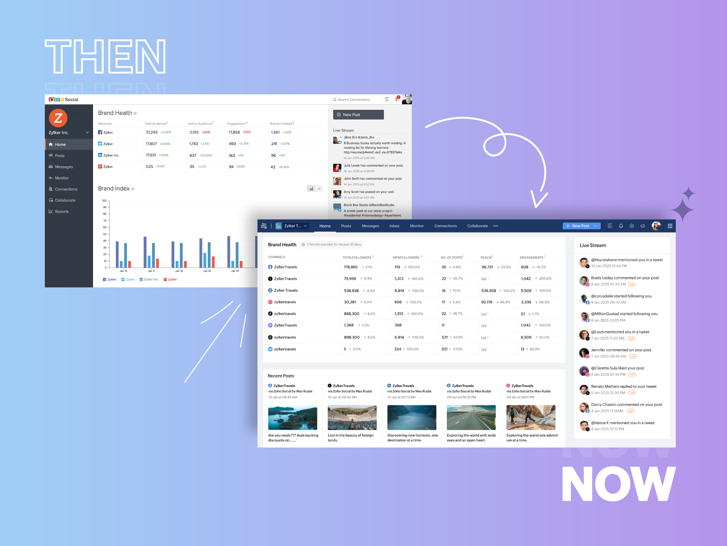 As the world was battling to survive through some of the worst times we'd all faced, Zoho Social was being fine-tuned to help businesses easily go remote without any hassle. With the motive to brighten things up and make it easier to navigate, Social was made more colorful while drop-downs and re-arrange options were introduced to allow quick shuffling between brands and channels.
