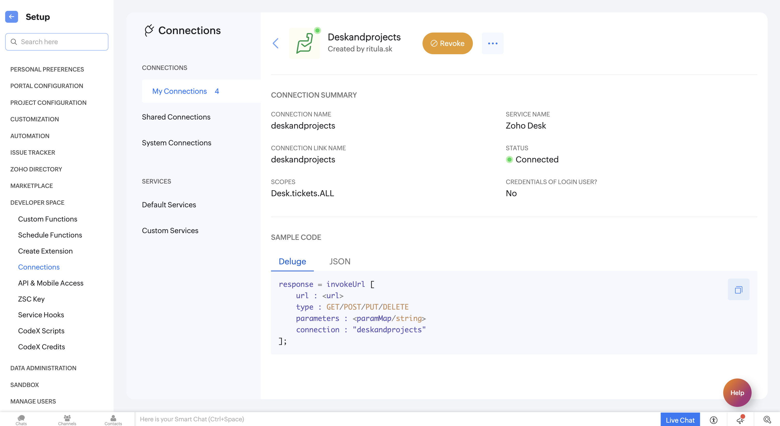 - Create a separate connection named "deskandprojects" with the scope Desk.tickets.ALL.