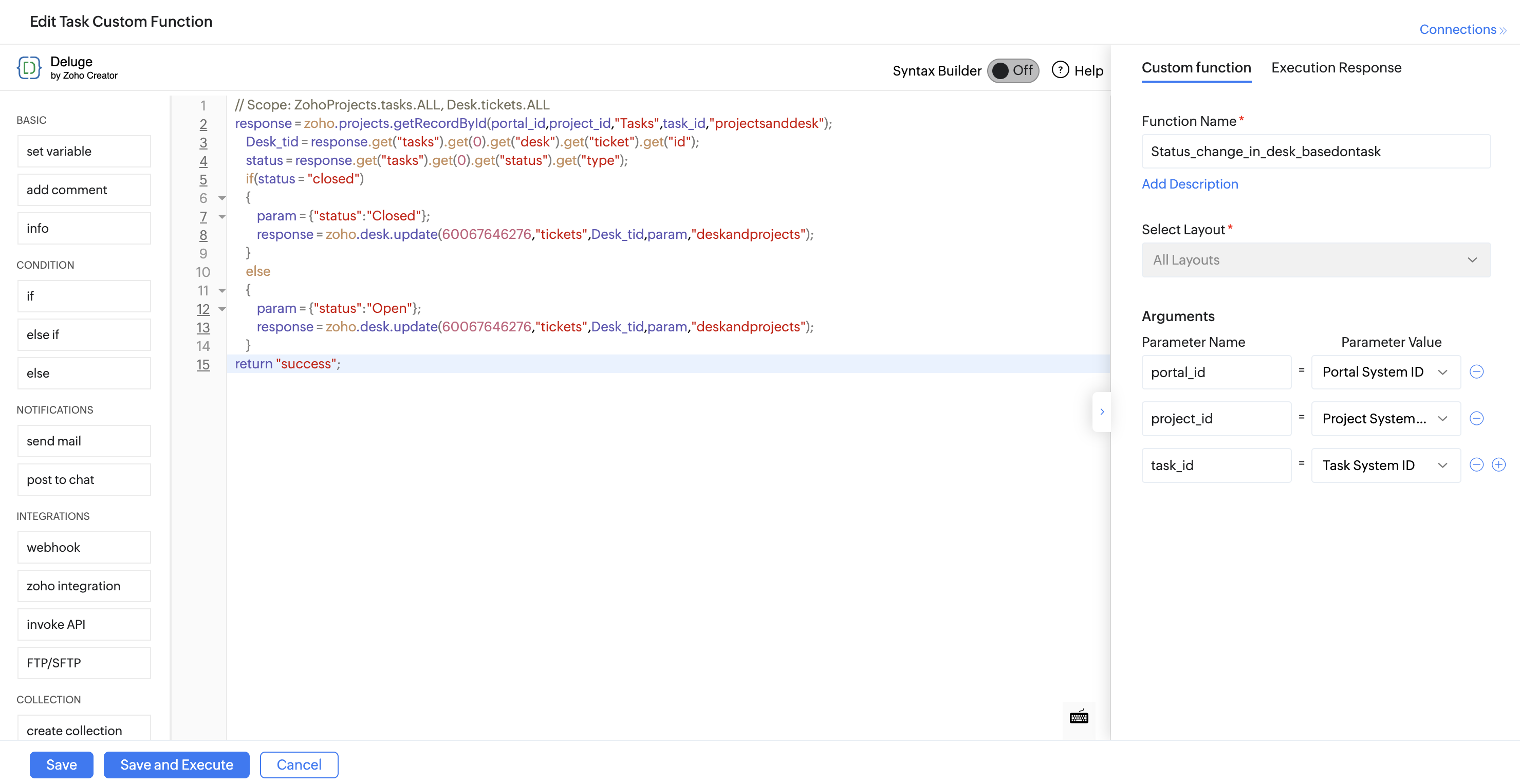 - Lines 8 and 13: Uses the "deskandprojects" connection to update the linked ticket in Zoho Desk.