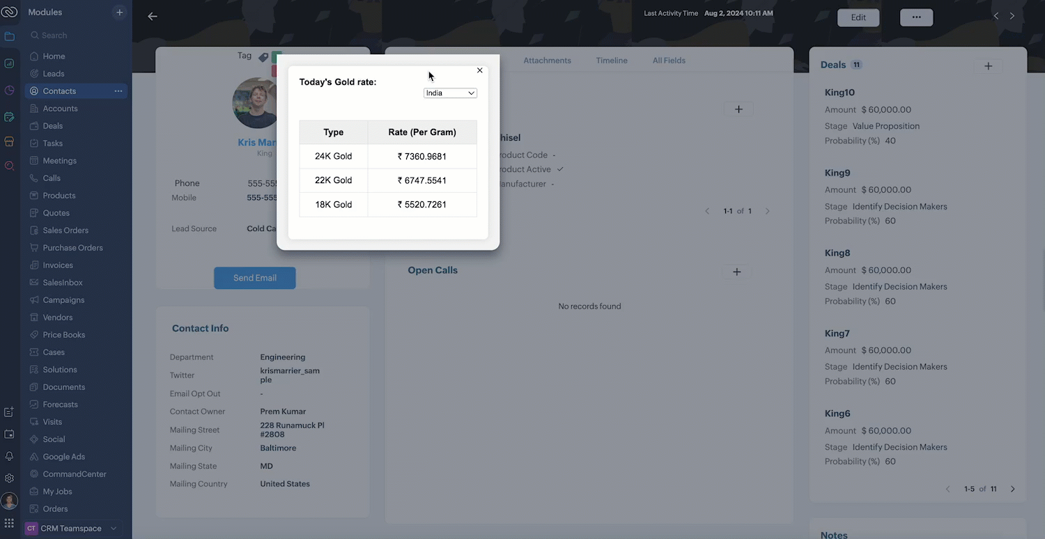 At Zylker, an international wholesale company using Zoho CRM, salespeople need a quick way to check real-time gold rates from different countries while discussing bulk orders with retailers. The solution should provide seamless access to updated, region-specific gold rates directly within the CRM interface to assist with accurate pricing decisions during customer interactions.
