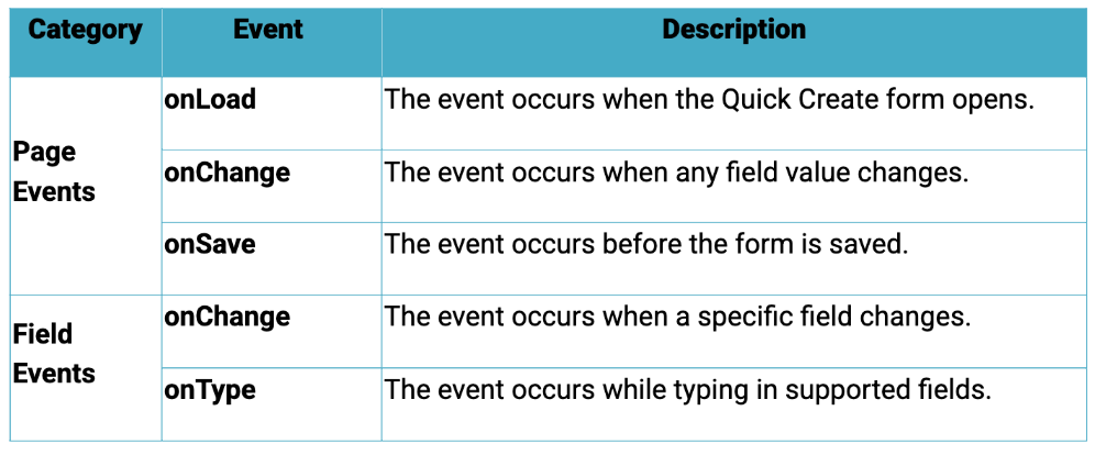 Quick Create component is a mini form used to create a record and associate it to the parent record from a lookup field. Client Script support for Quick Create forms lets you trigger actions on load, change, or save.