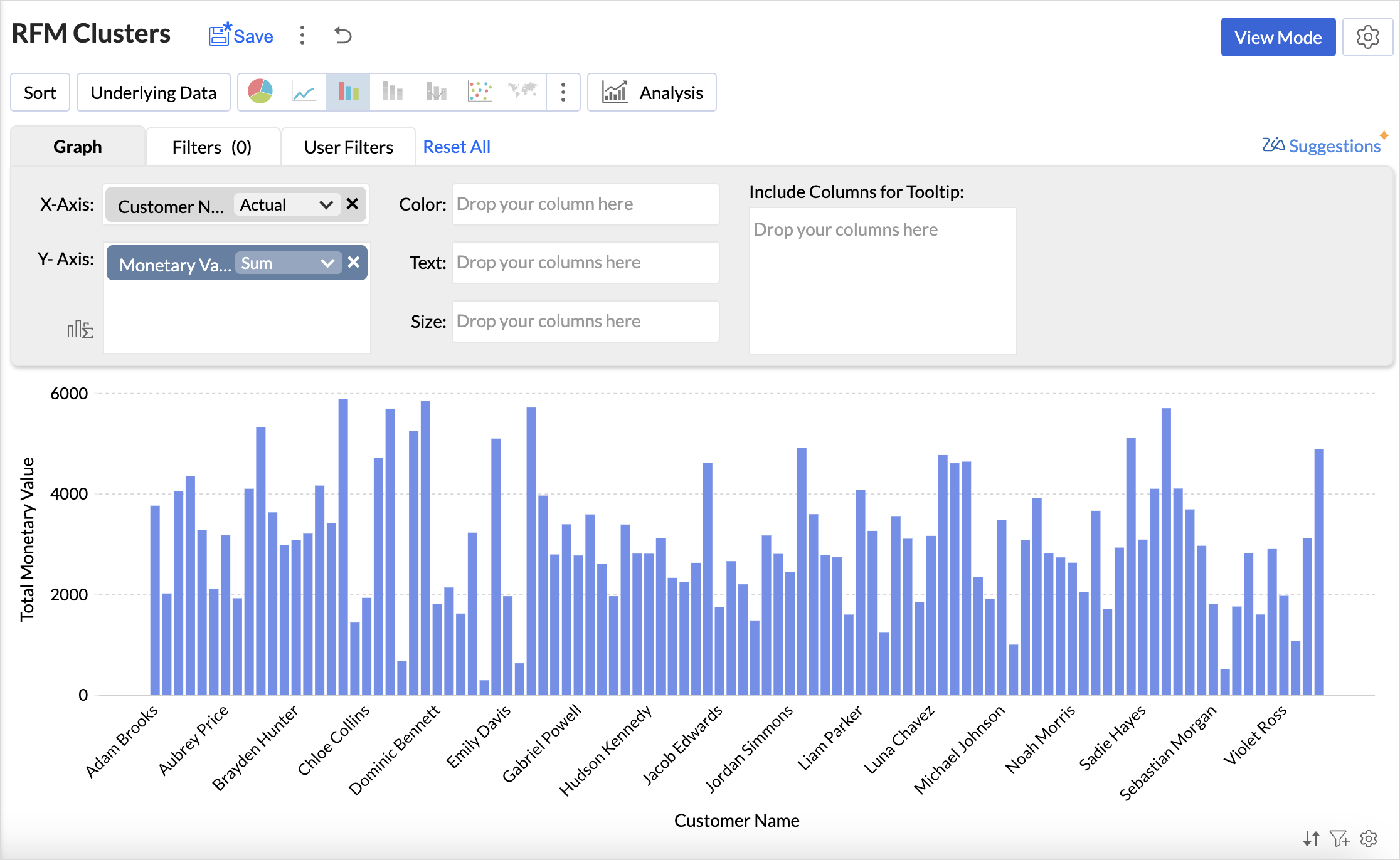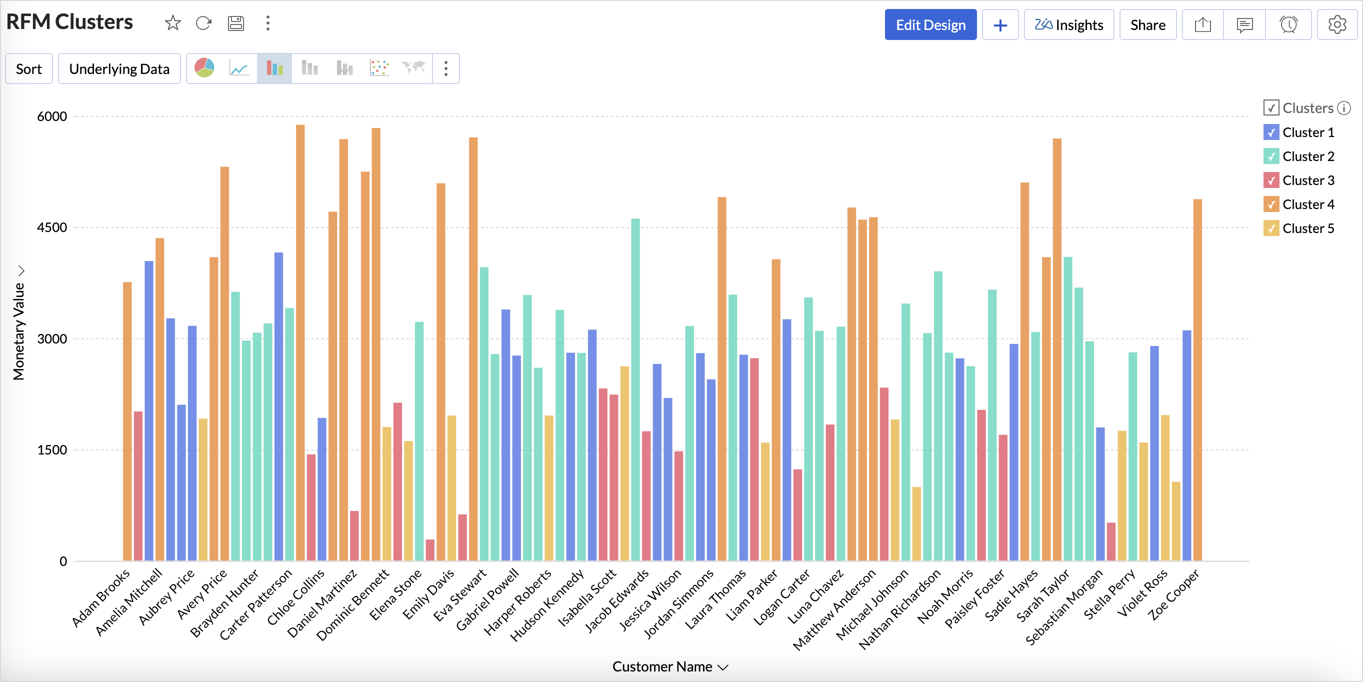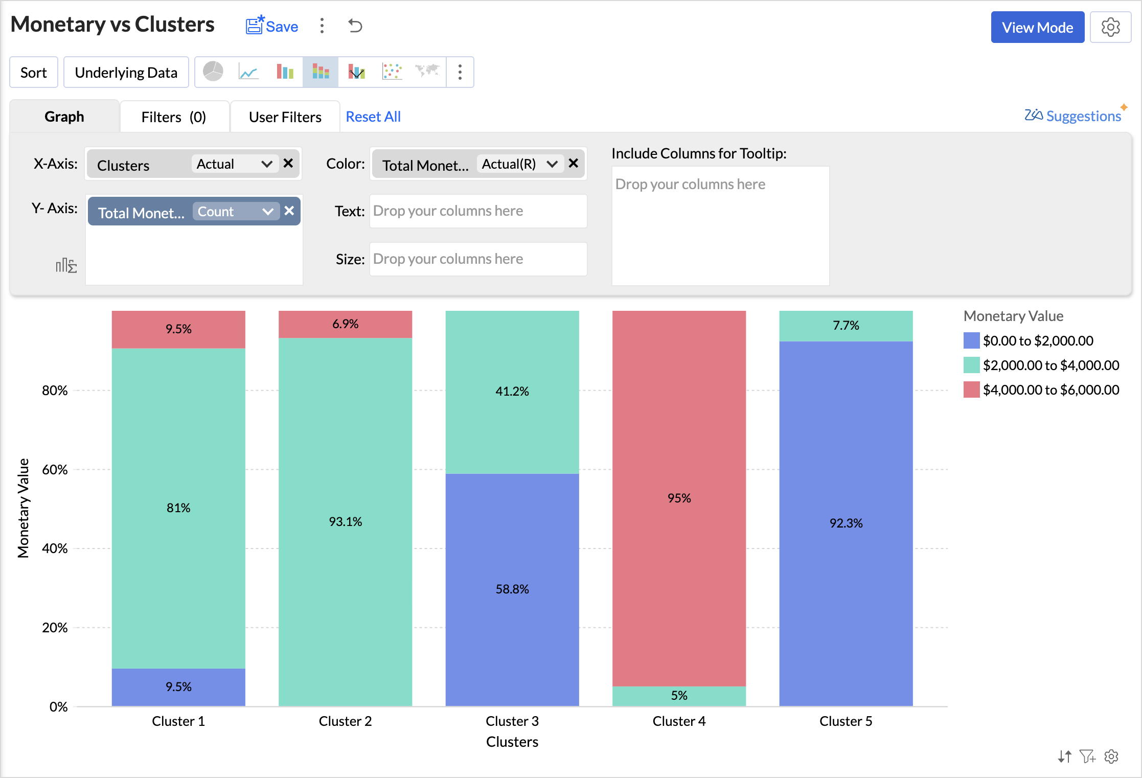 Once the customer profiles have been segmented using cluster analysis, Export the Current view in the preferred table format to build more data visualizations to understand the clusters.