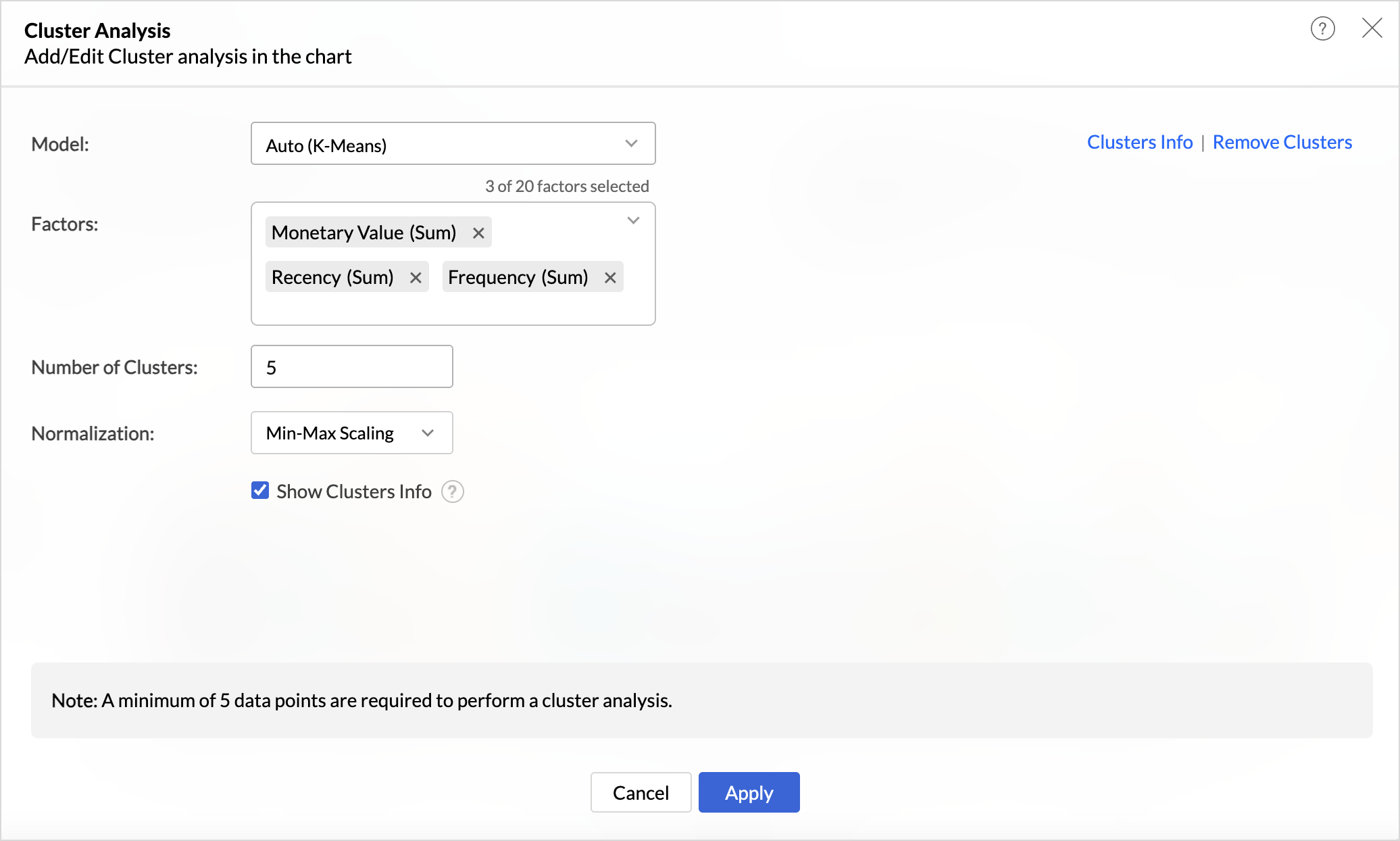 - By default, the columns dropped in the shelves (Monetary Value) are selected as factors. Click the drop-down icon to include Recency and Frequency columns as factors.