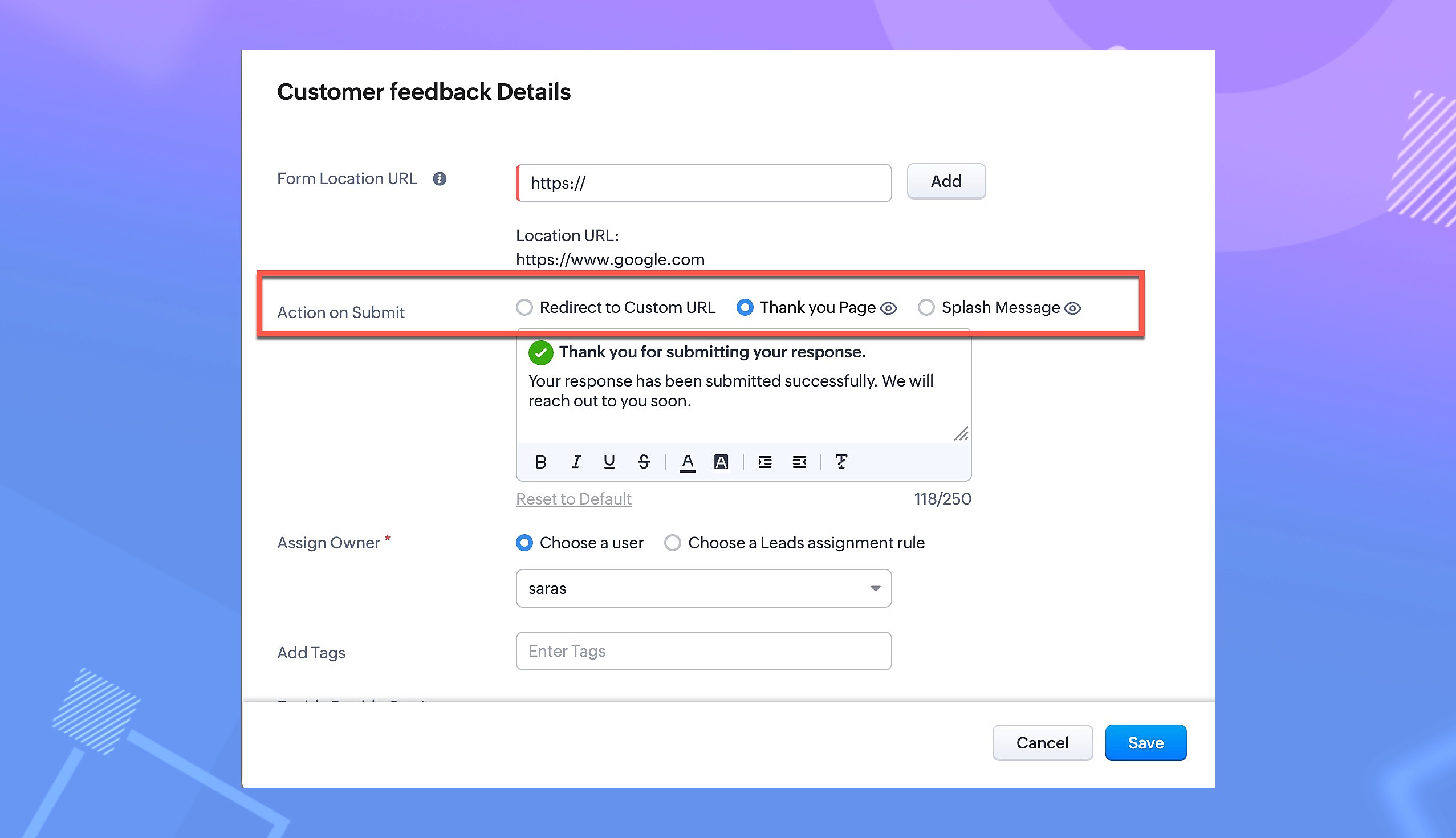 The thank-you page serves the purpose of offering users without a custom webpage a system-defined space to showcase a personalized success message post-submission. You also have the flexibility to customize the content on this "thank you" page, enhancing the overall post-submission experience for your users.