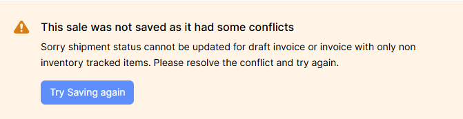 Sorry shipment status cannot be updated for draft invoice or invoice with only non inventory tracked items.”