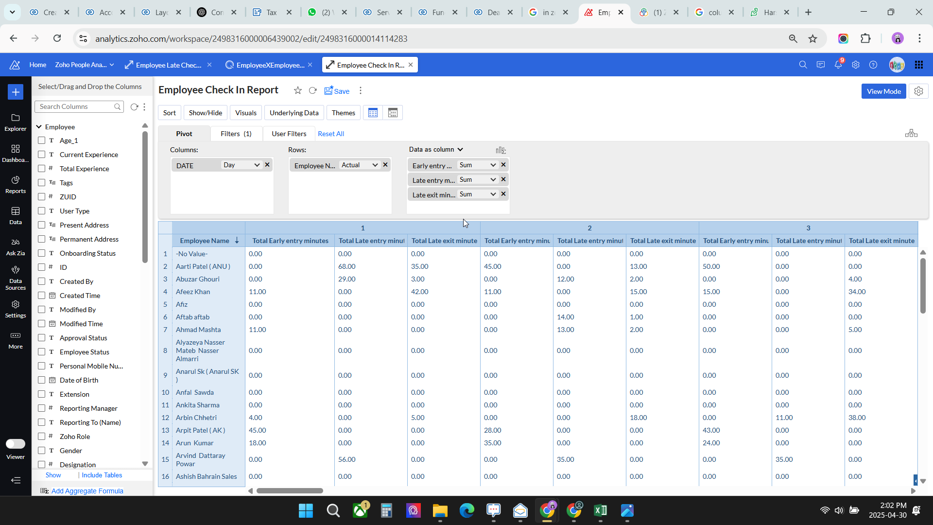 I need the data to include: Employee Name Late Entry, Early Entry, Early Exit, Late Exit, First In, Last Out, and Total Hours.