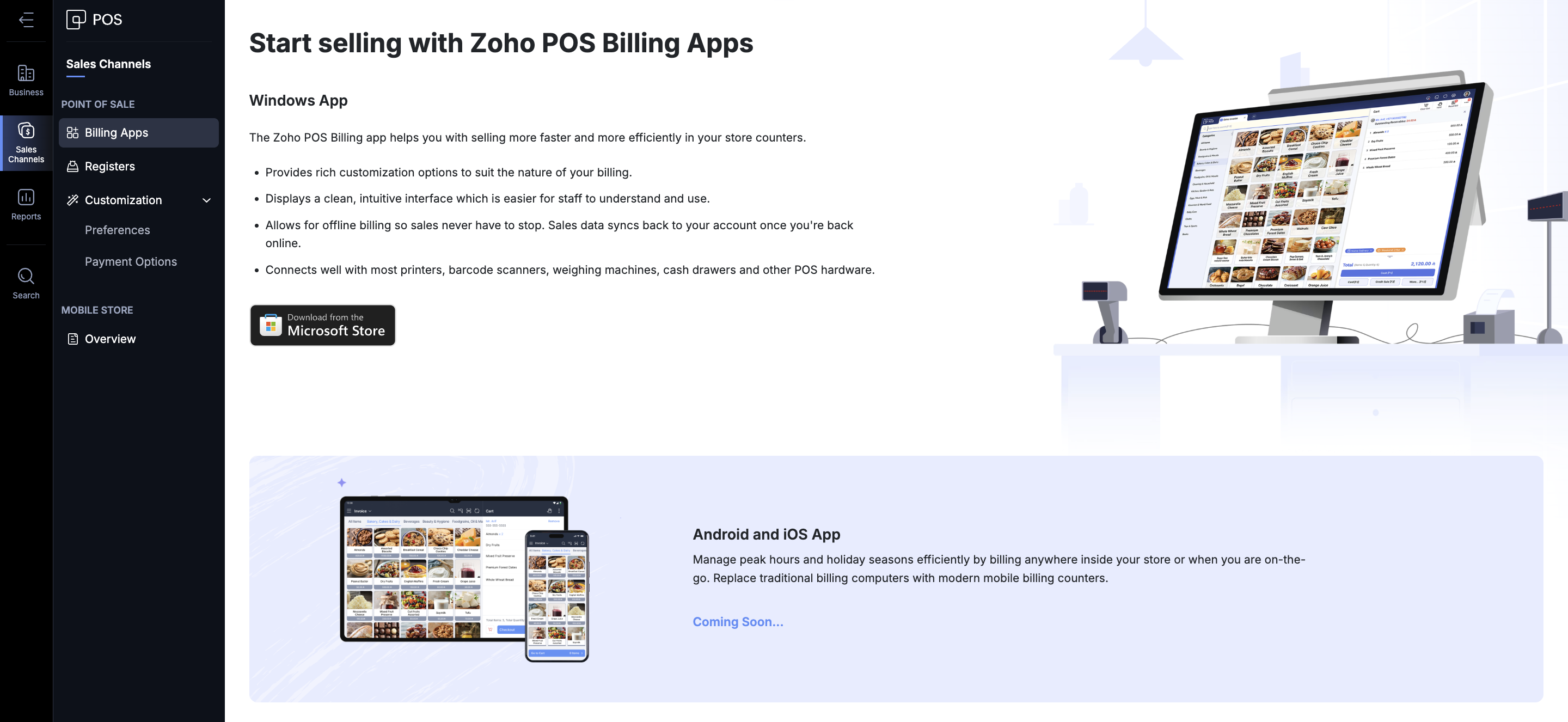 Zoho POS offers various ways in which you can process a sale. You get the Zoho POS app for the Windows operating system, mobile apps for Android and iOS (coming soon), to help speed up sales at the store. You can create invoices, sales orders, process refunds and exchanges, accept payments, and record each transaction. The total sales carried out during a specific time (session) can also be monitored and tracked from the Windows application. The app can be integrated with your hardware components such as scales, cash drawer, pole displays, and printers. Even in the event of an internet disruption, Zoho POS continues to work for you and saves bills offline. Once the internet connection is restored, the data gets synchronized with the web application, ensuring smooth operation at all times.