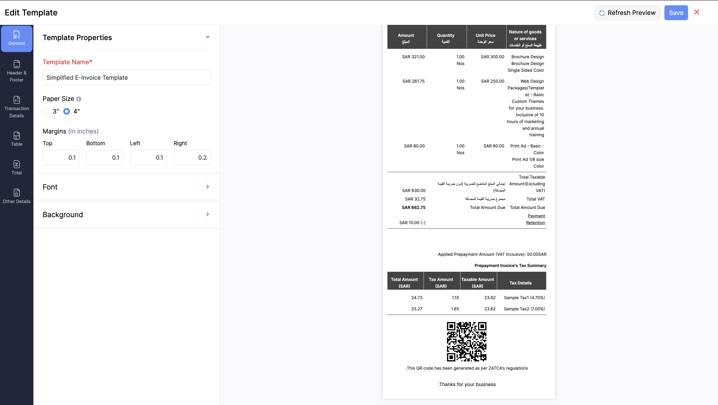 As part of ZATCA's Phase 1 regulations, it's mandatory for businesses serving customers in Saudi Arabia to generate an e-invoice at the point of sale. It should contain all the key information, such as: Retailer’s name, Retailer’s VAT Registration Number (TRN), Invoice date and time, Total invoice amount (including VAT), and the Total VAT amount. Zoho POS is equipped with everything you need to stay compliant with these regulations by helping you generate e-invoices in Arabic, with QR codes that contain all necessary information.