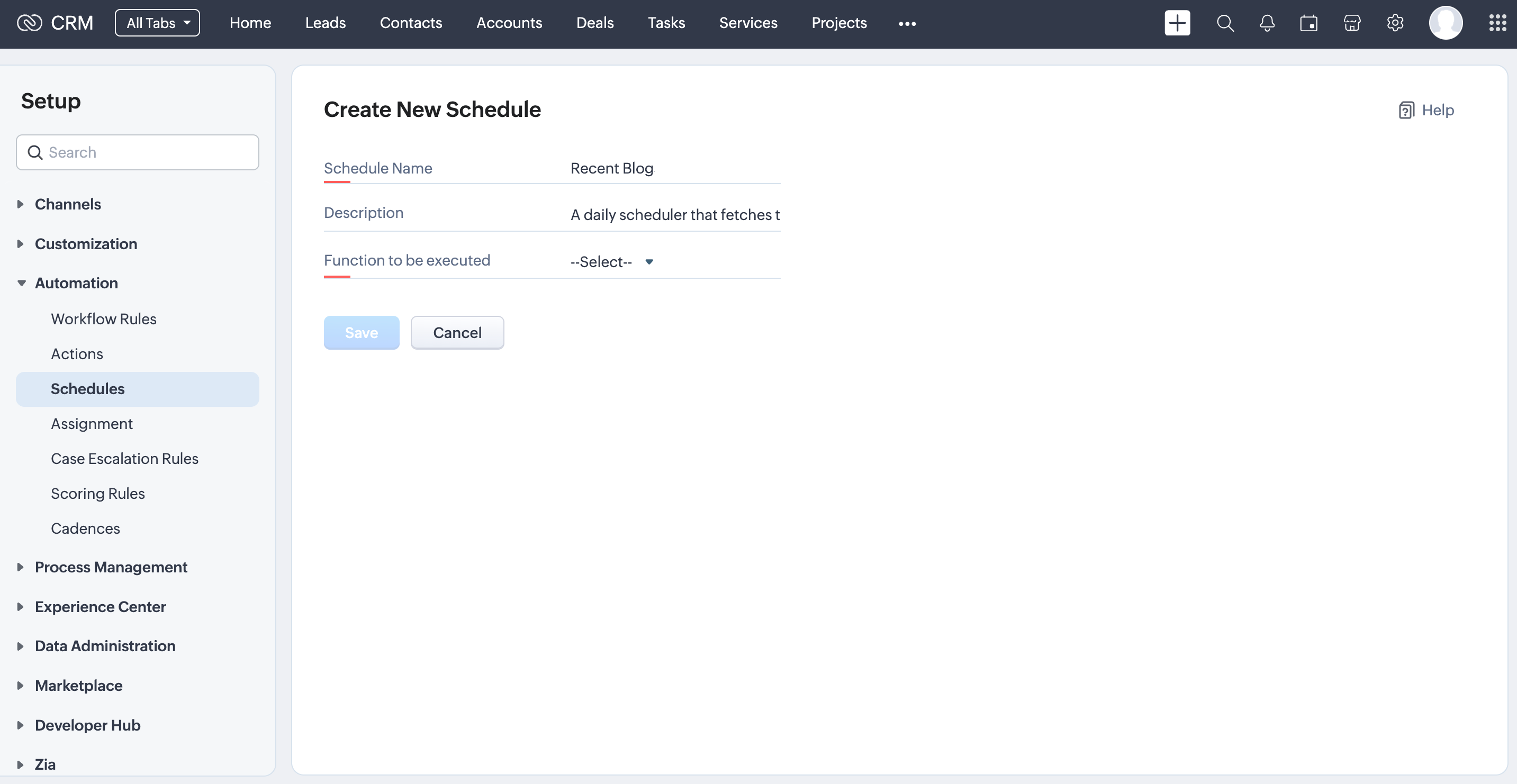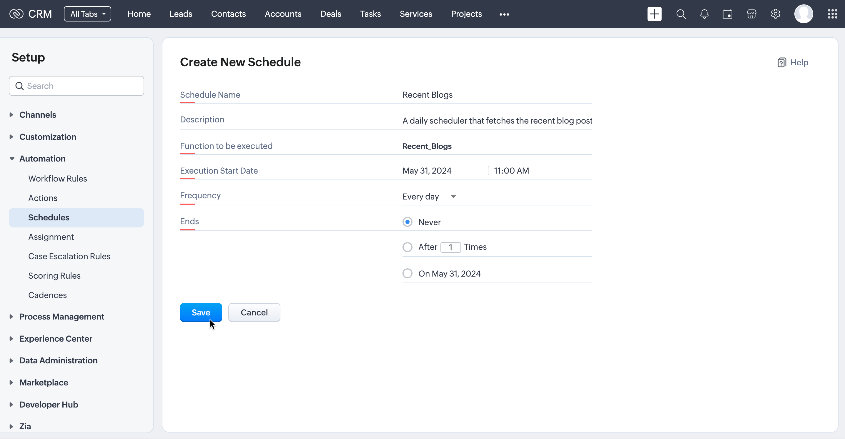 Step 1: Go to Setup > Automation > Schedules in your Zoho CRM.