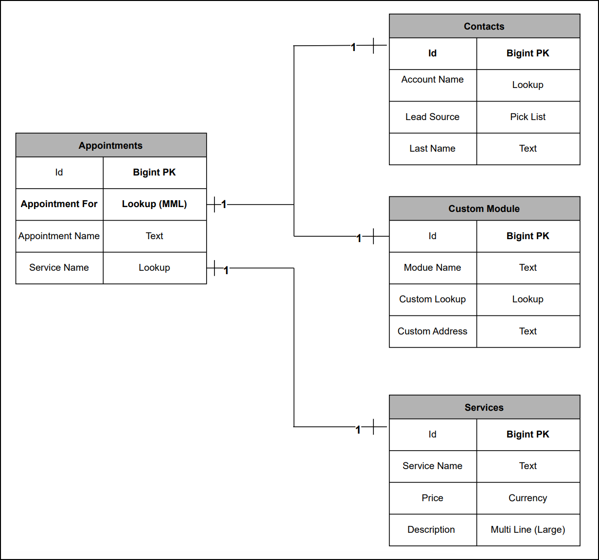 "multi_module_lookup": { "display_label": "Appointments", // Display label of the module where the MML field is used "api_name": "Appointments__s", // API name of the Appointments module "modules": [ //List of modules associated with the Appointments module. { "api_name": "Contacts", //API name of the associated module "module_name": "Contacts", // Display Name of the module "id": "5725767000000002179" //Unique ID of the module }, { "api_name": "Patients", //API name of the associated custom module "module_name": "Patients", //Display label of the module "id": "5725767000006473007" //Unique module ID } } ] },