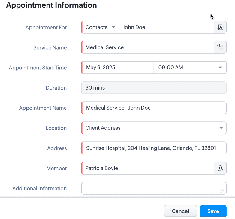 The below image shows how these system-defined mandatory fields appear in the Appointments module UI: