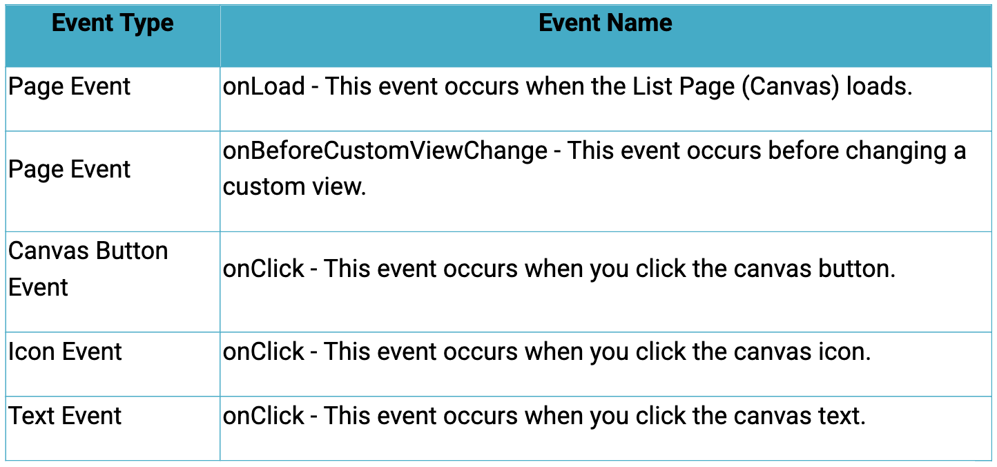 You can trigger Client Script on your List Page (Canvas) using the following events.