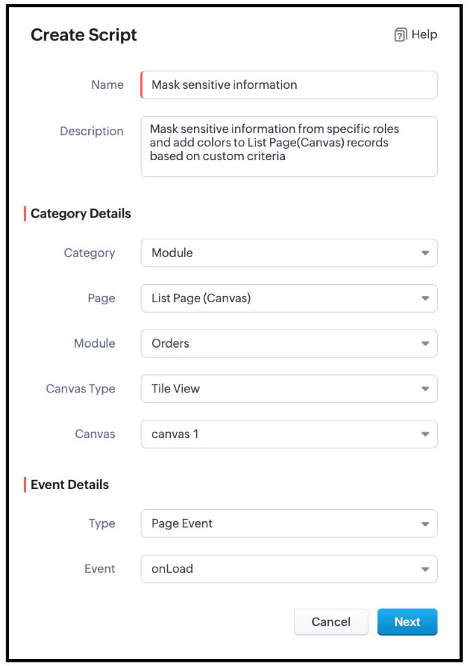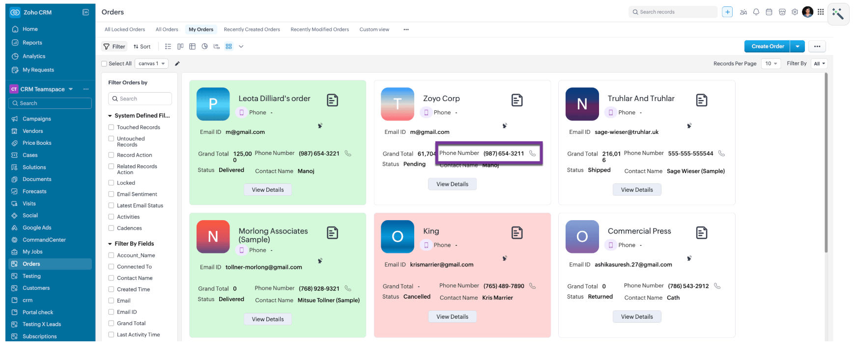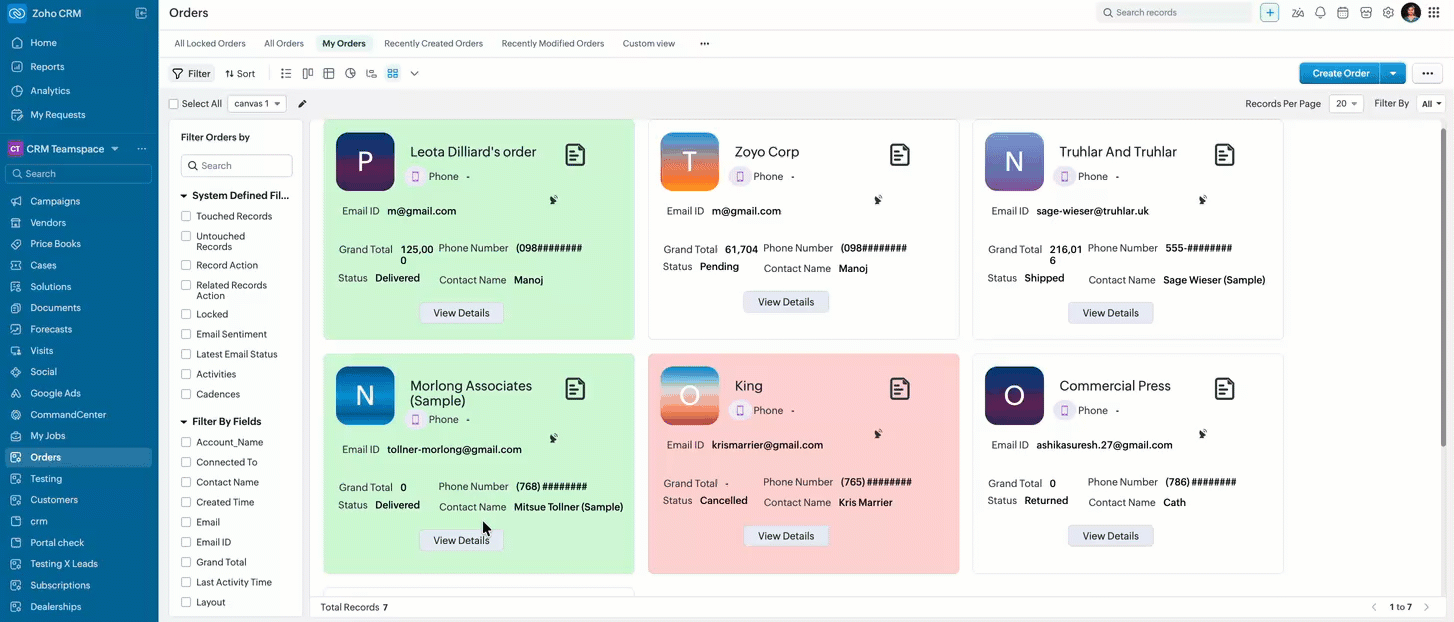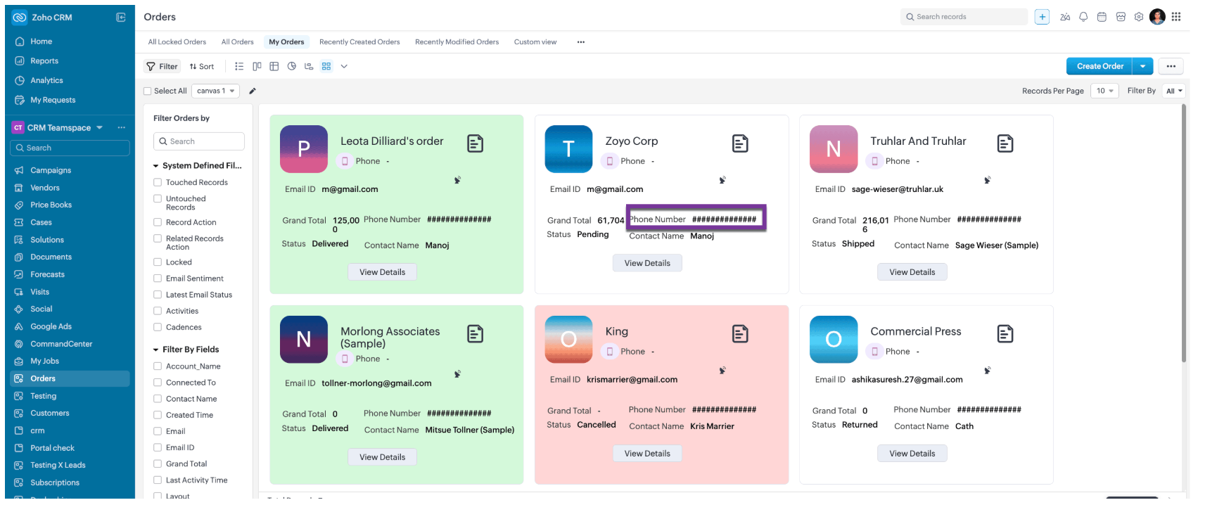 Zylker uses Zoho CRM to manage high-volume orders where customer phone numbers are sensitive data. The CRM Admin wants role-based phone number masking on the Orders List Page (Canvas). To improve visibility and speed, the Admin also wants color-coded order cards in the List View based on order status.