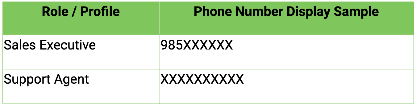 - When the role is Support Agent, use ZDK.Page.getList().maskField() on the Phone_Number field to mask all 10 digits, fully hiding the phone number using the same masking parameters.