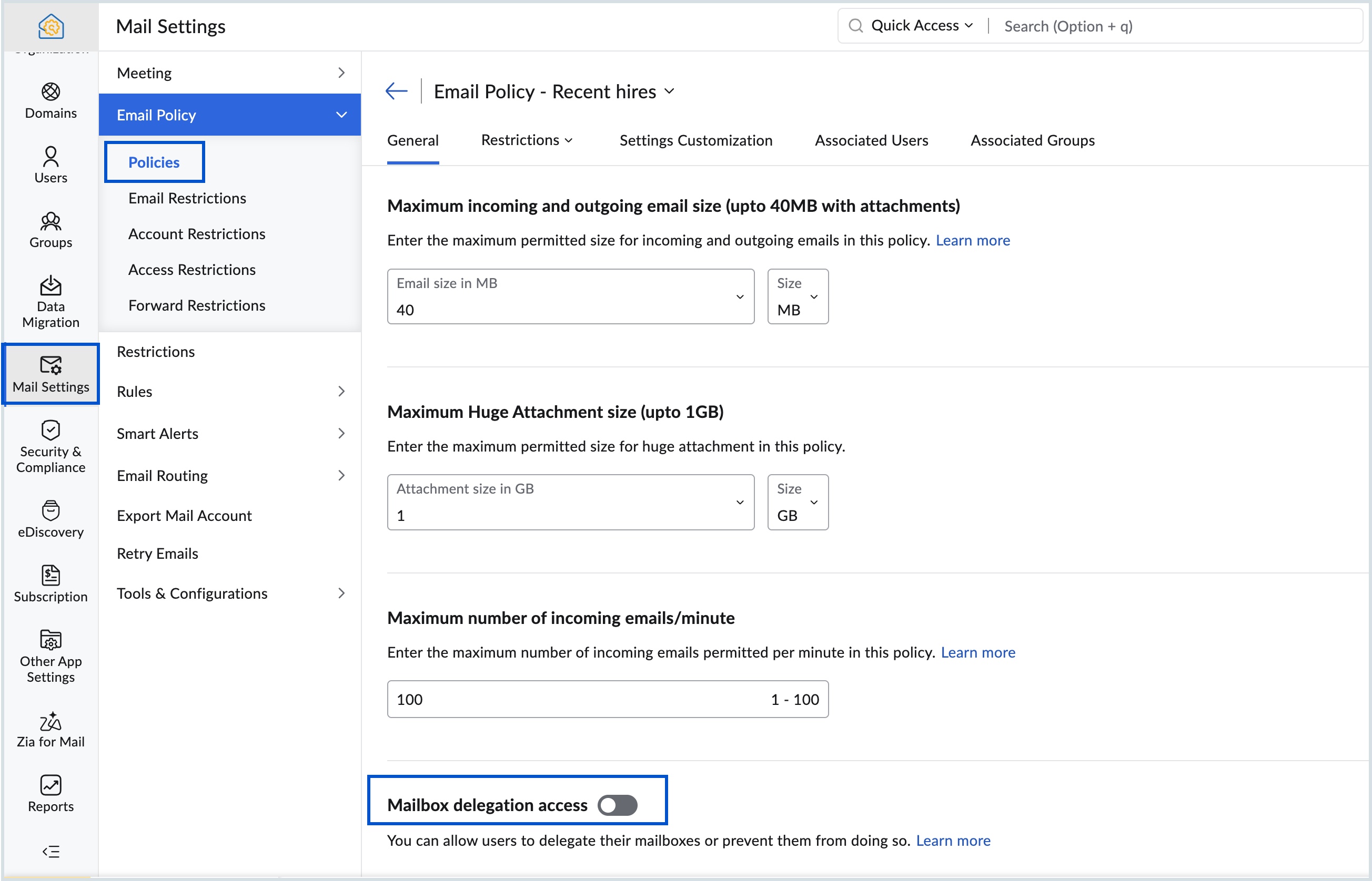 Choose the policy for which you want to enable/ disable Mailbox delegation access.