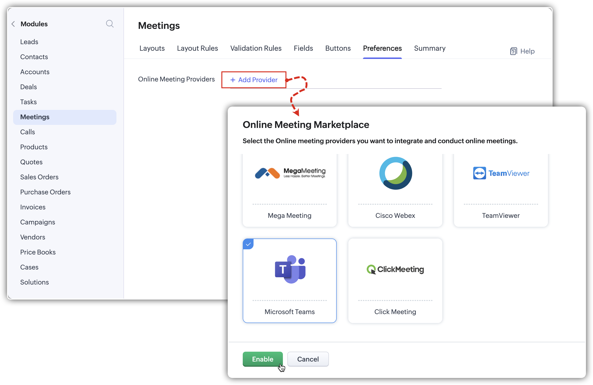 Admins can enable Microsoft Teams directly from the Preferences tab under the Meetings module without needing to navigate separately to the Marketplace.