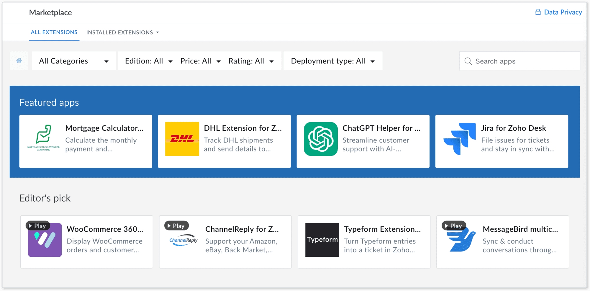Marketplace is a centralized platform where users can discover Zoho and third-party applications that can be integrated with their Desk account to facilitate various business processes. It's straightforward: Admins can search for, install, and manage the installed extensions directly from the Marketplace.