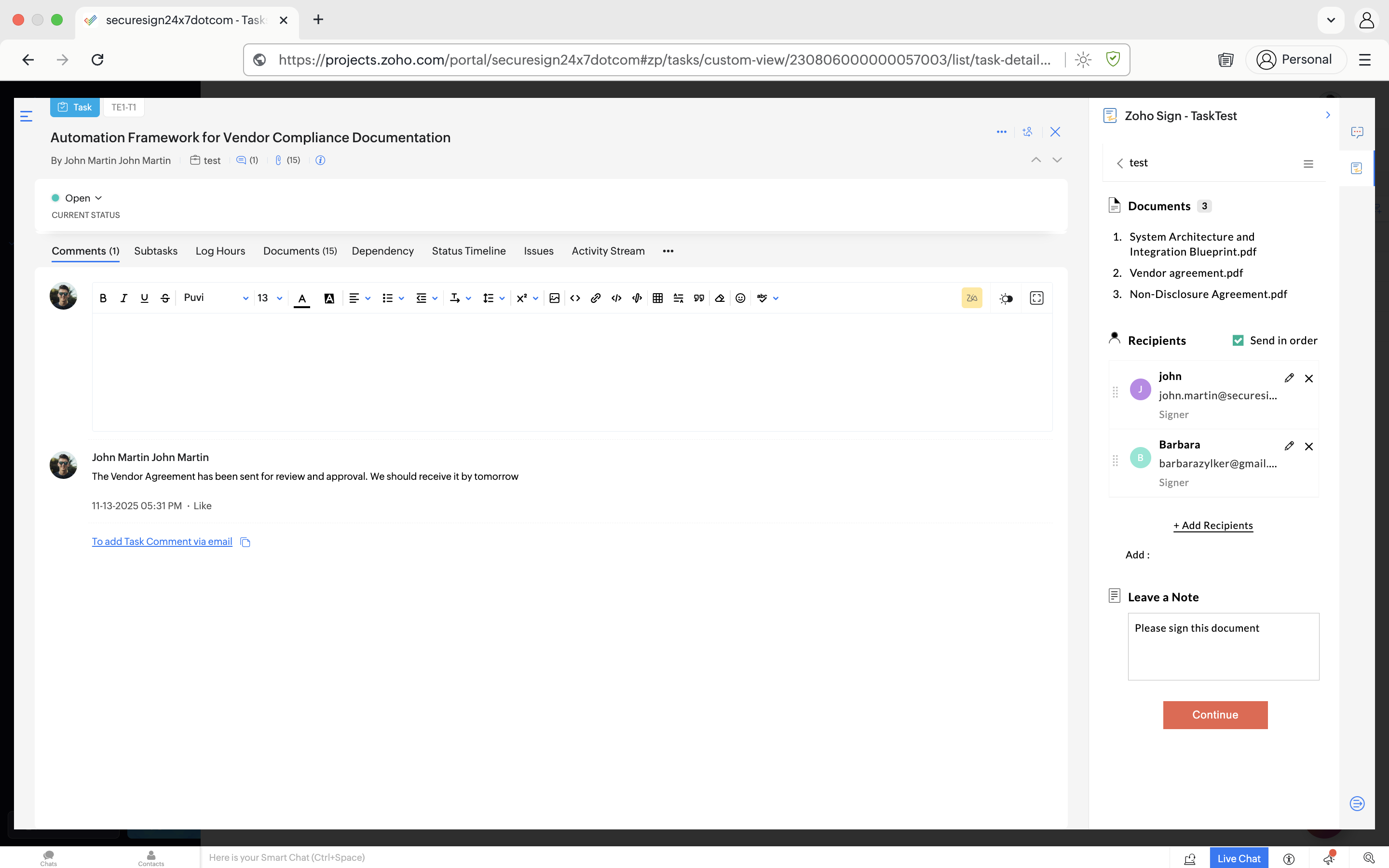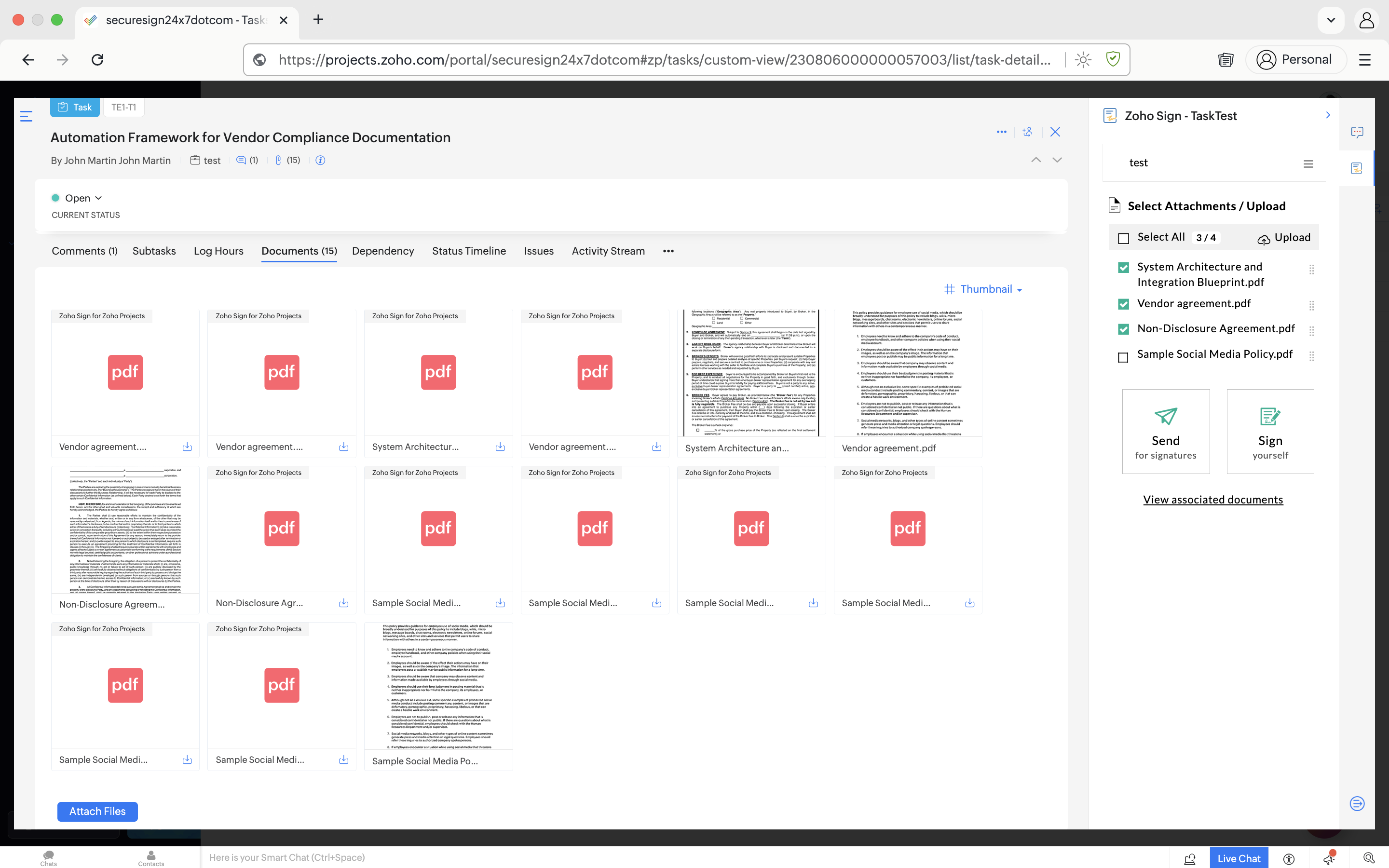 - Send documents for e-signature directly from Zoho Projects tasks or issues.