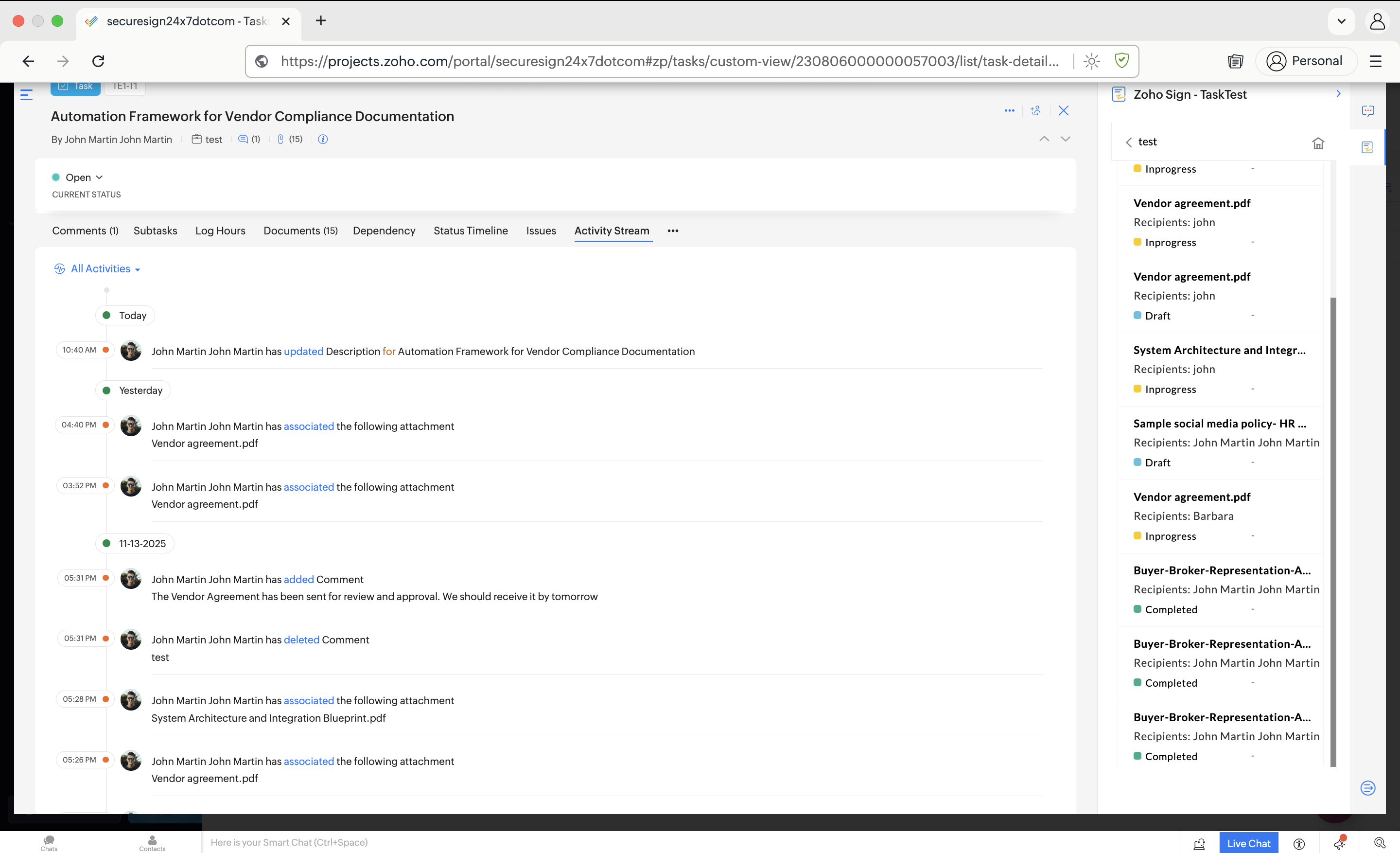 With this integration, users can now send documents for signatures, track their progress, and manage approvals—all without leaving Zoho Projects.