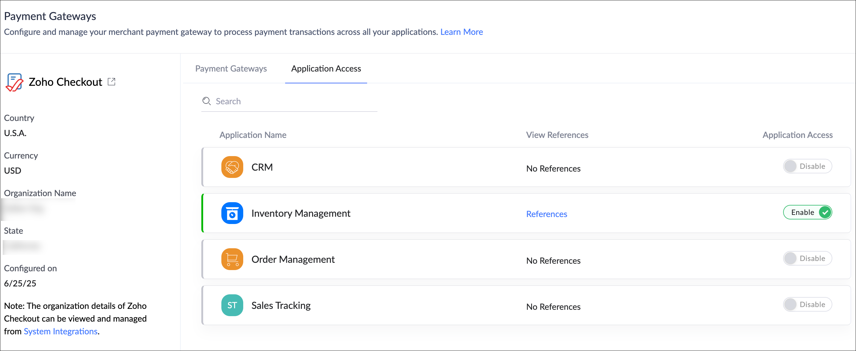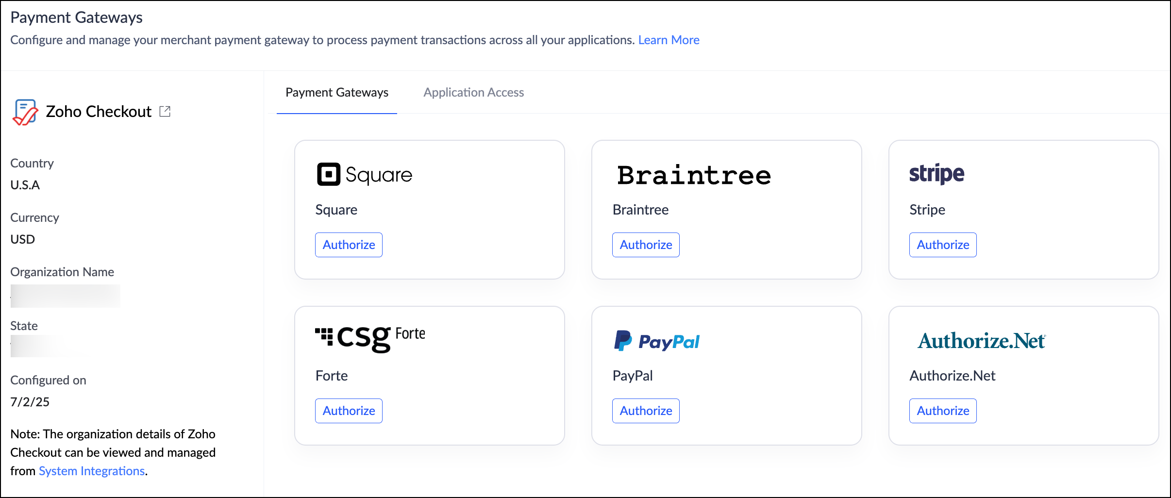 The first time you visit Payment Gateways (before configuring Zoho Checkout within System Integrations), you'll be prompted to complete a one-time setup.