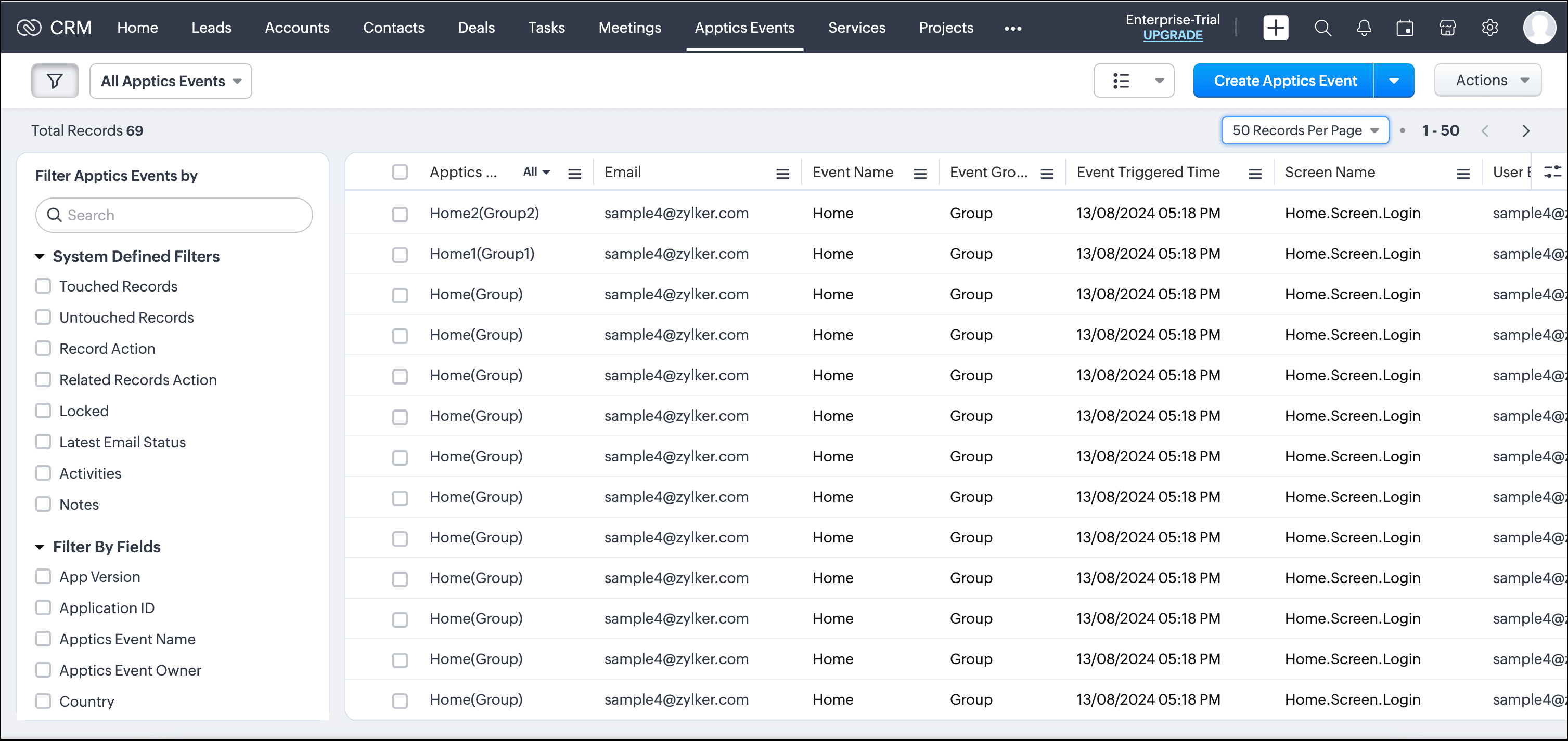 Note: Apptics events will be synced and pushed to Zoho CRM daily, at 00:00 hours for your portal timezone.