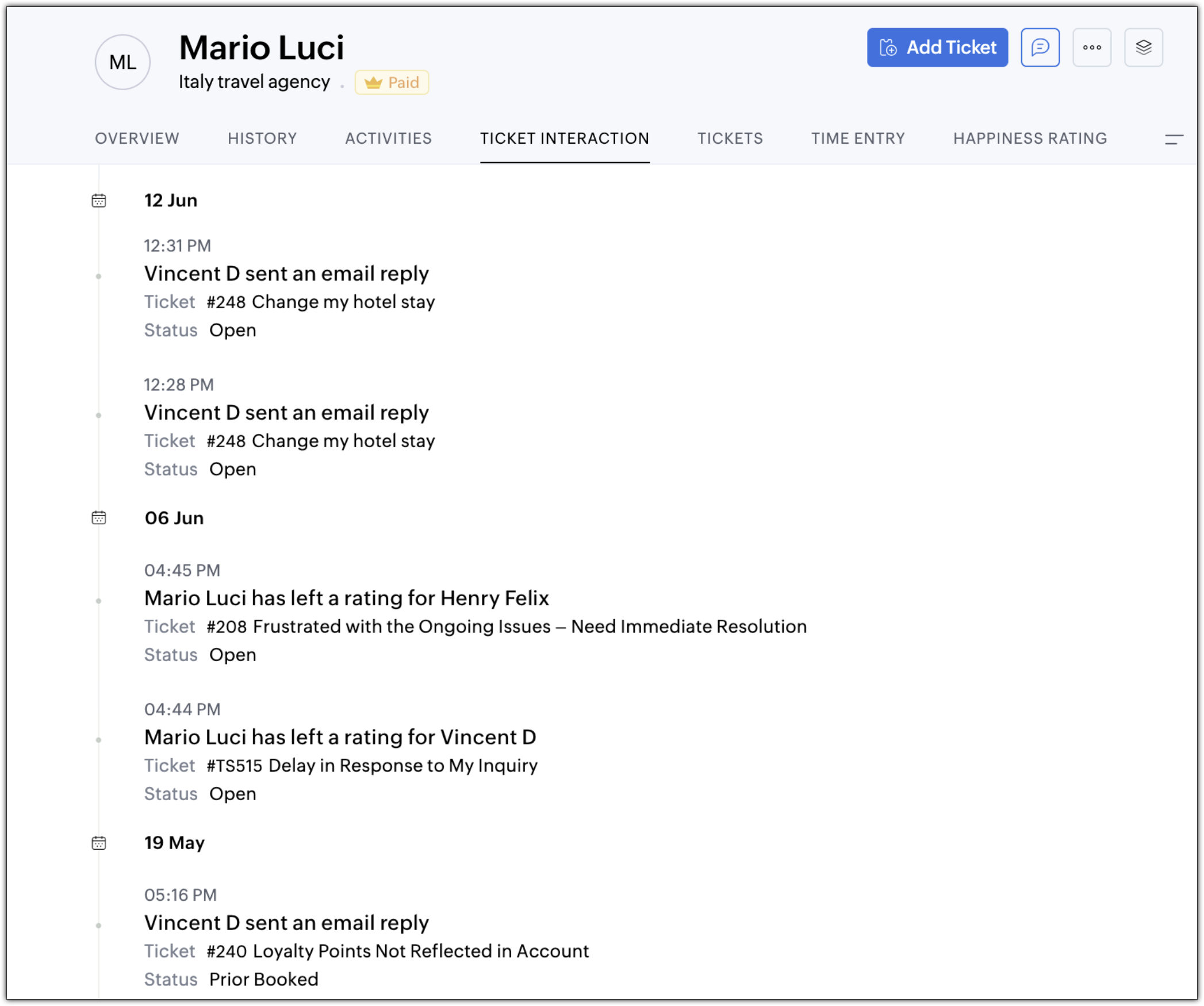 - Timeline of every interaction related to tickets (replies, comments, ratings, etc.) with the account or contact