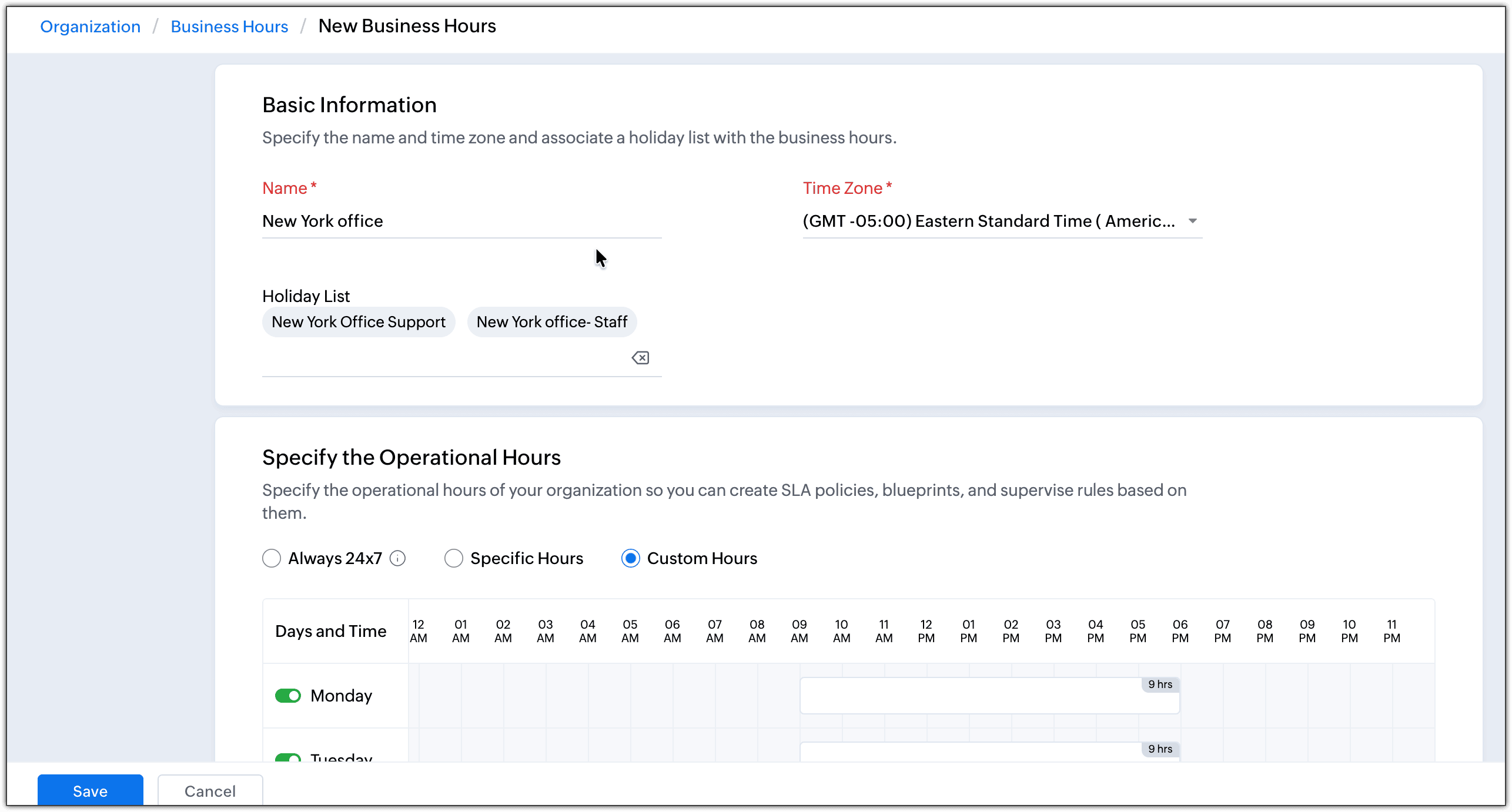 Businesses can create holiday lists for up to two years in advance and also associate multiple holiday lists to one set of business hours.