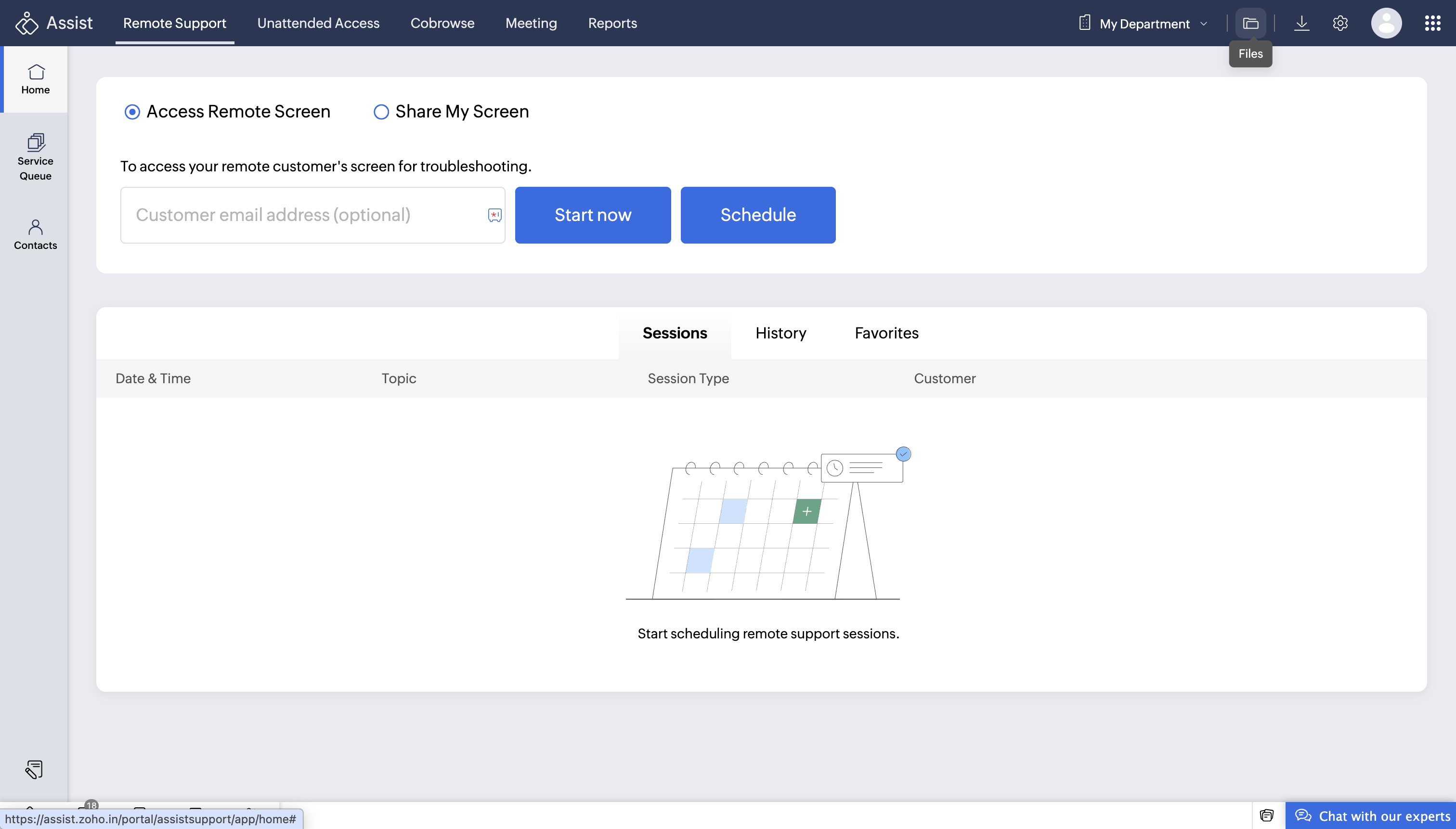 To get started, log in to Zoho Assist using your credentials. Once you’re in, navigate to the Files icon located in the top-right corner of the dashboard and select it. This section gives you quick access to all your session recordings in one place.