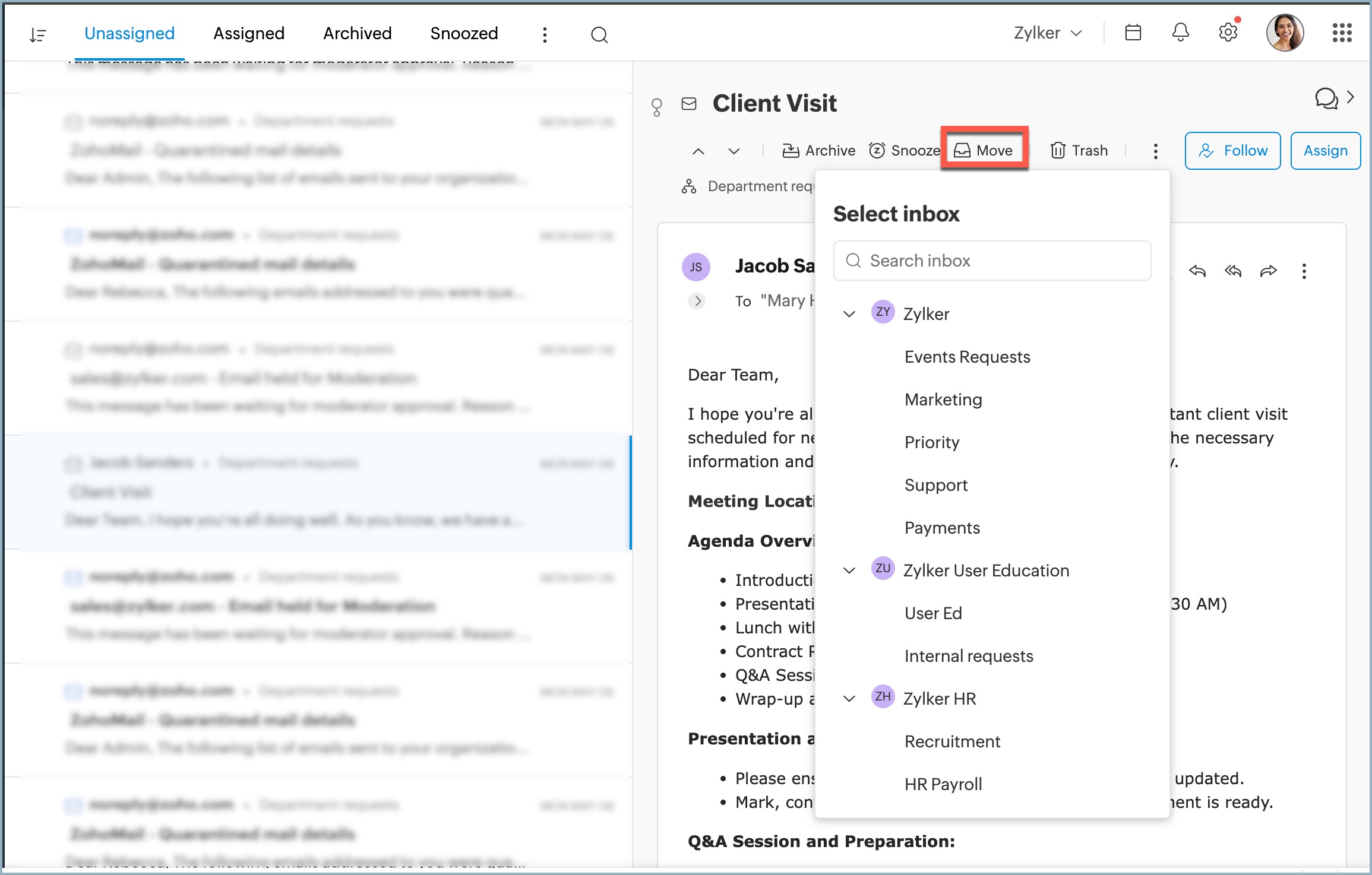 Move threads using the “Move” option.You have the option to move thread to another inbox from the preview pane.