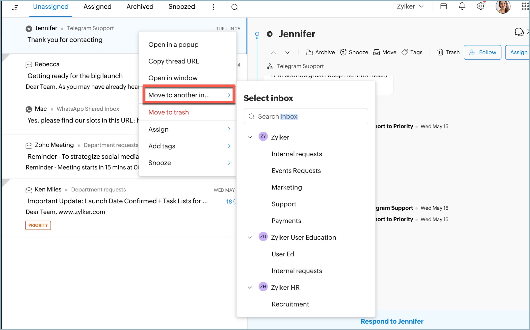 There are four different ways to move threads across inboxes in Zoho TeamInbox.