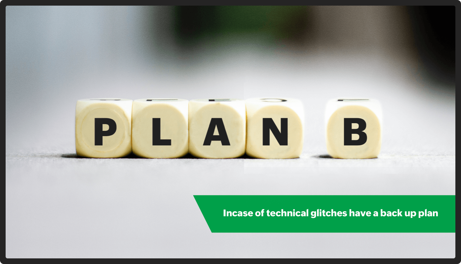 Technical glitches are beyond our control, and might include mic dysfunction, network issues, or a laptop freeze. While it is advisable to carry a spare laptop, rehearse your presentation without the deck so you have a backup plan if something goes wrong. It's helpful to have some facts or interesting information on your topic prepared in case you need to fill time while technical issues are resolved. You can also use downtime to recap everything you have covered so far or to lead a brief activity.