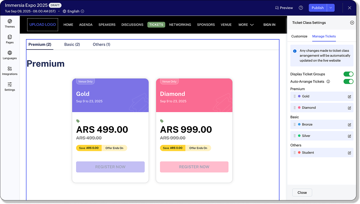 On the event website, tickets are displayed in their grouped structure by default, giving attendees a clear view of available options. Organizers can choose to disable this grouped display from the website builder if they prefer a simpler layout. Any ungrouped ticket classes are automatically displayed under an “Others” section, ensuring no ticket is left out. The grouped view is consistently shown across the Tickets page, the Select Tickets screen, and even when adding an order from the Orders tab.